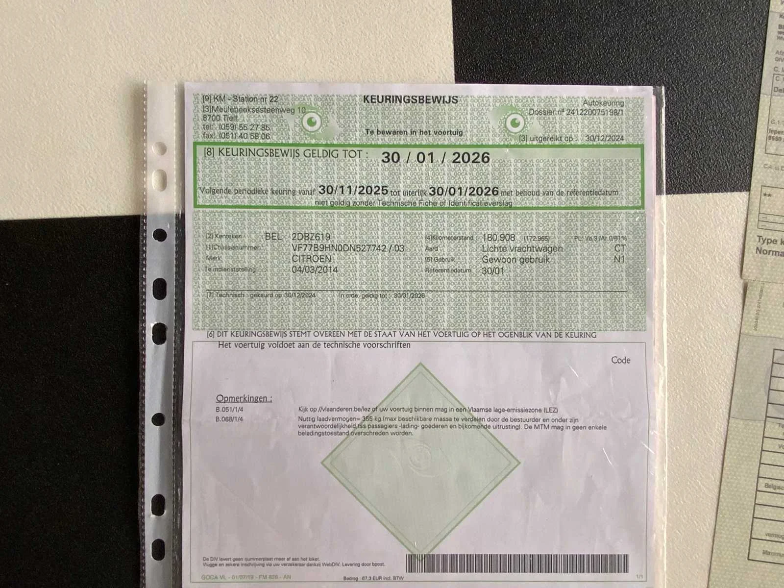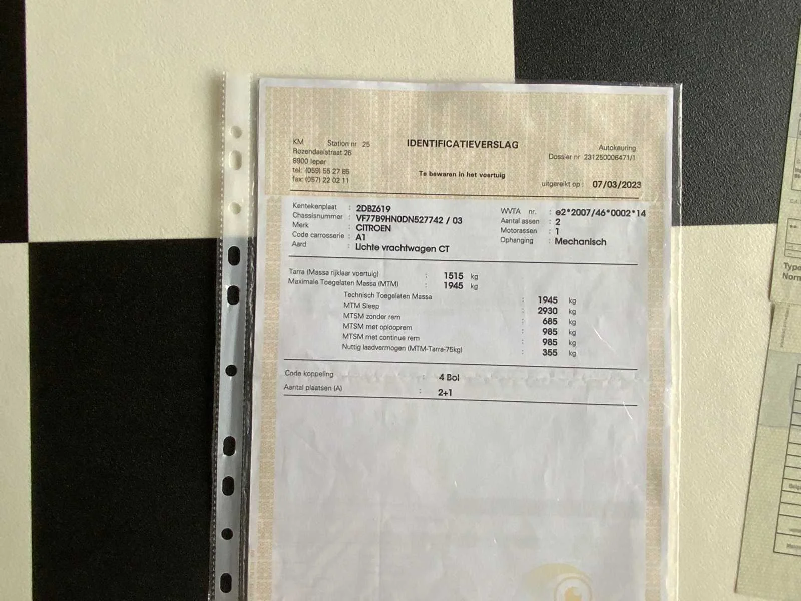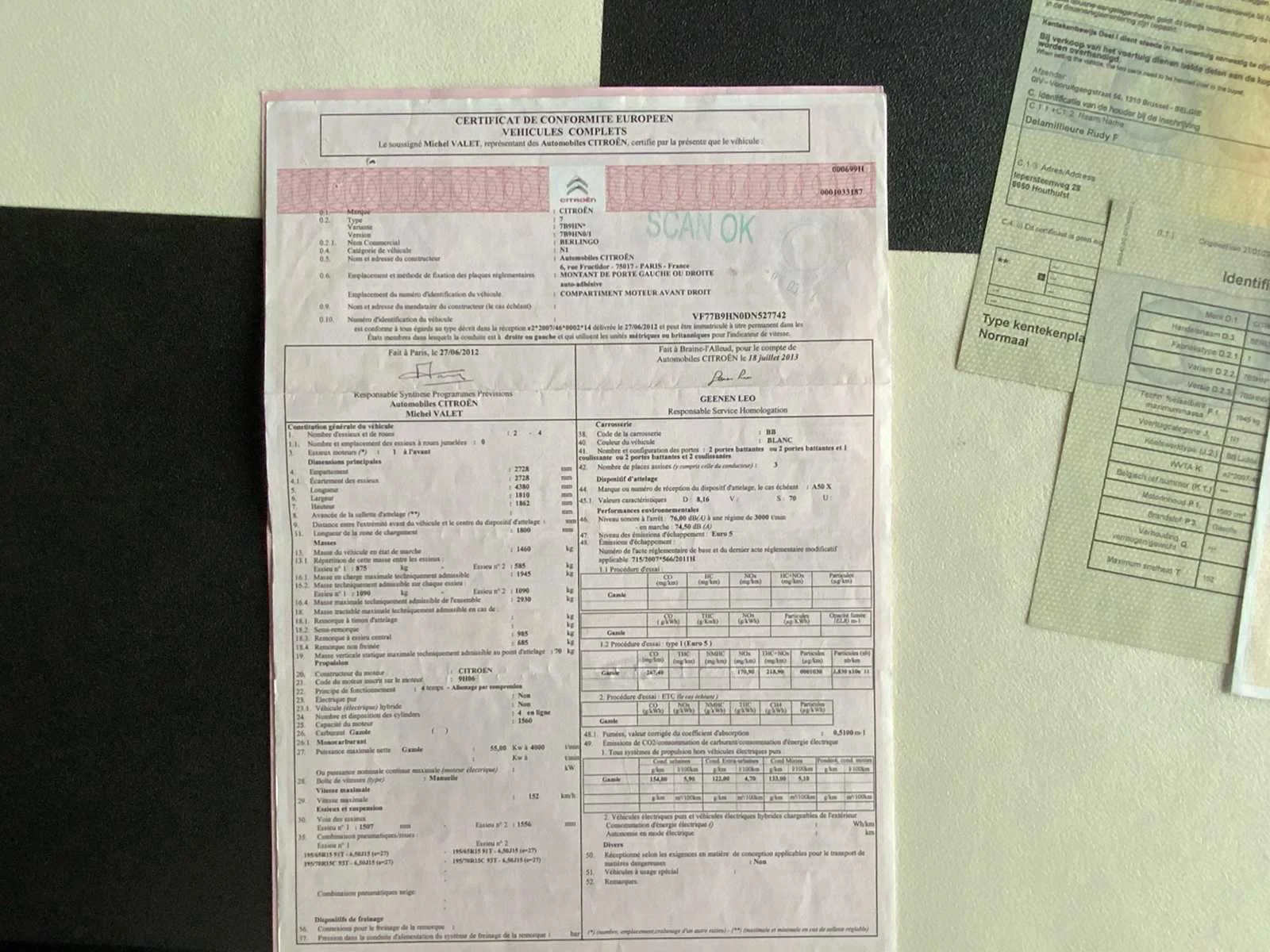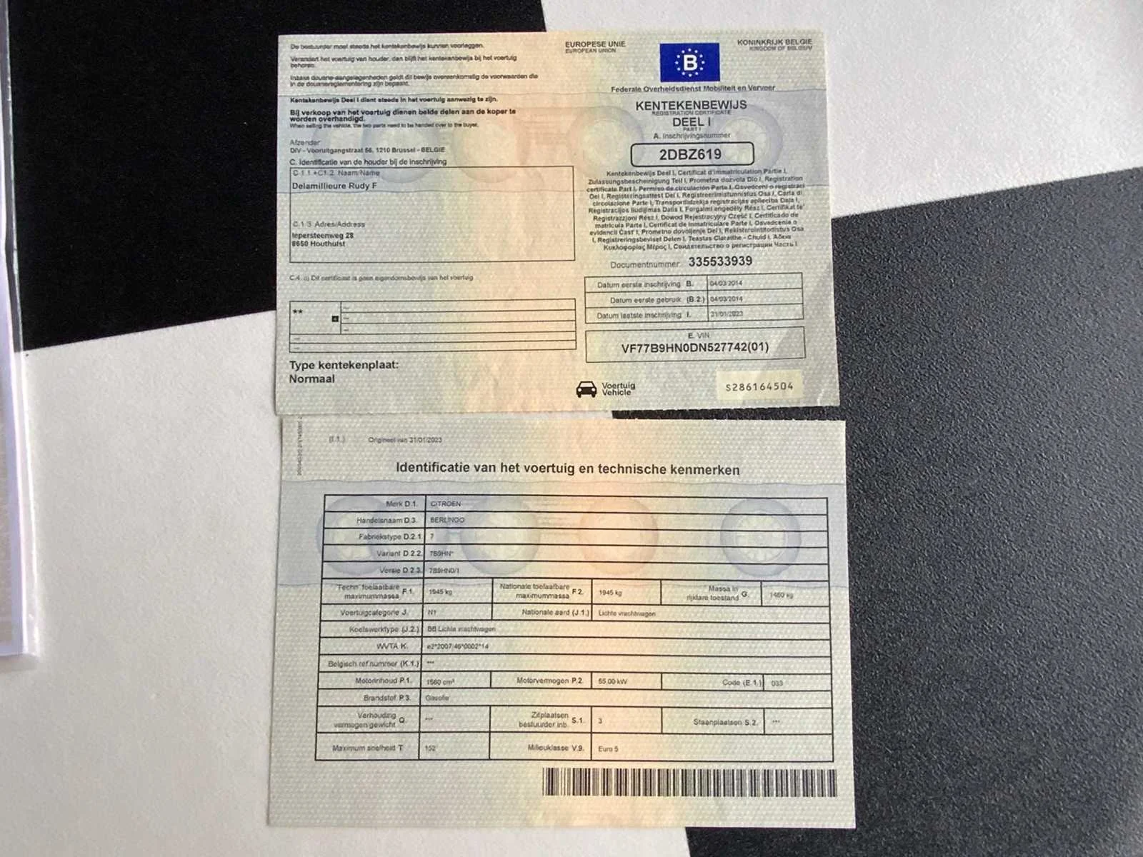 No Merk: Citroen Type: Berlingo Model: 7 Bouwjaar: 2014 Chassisnummer: VF77B9HN0DN527742(01) Afgelezen kilometerstand: 188071km Cilinderinhoud: 1560cc Vermogen (kW): 55kW Brandstof: Diesel Datum eerste toelating: 04/03/2014 APK vervaldatum: 30/01/2026 Transmissie: Handgeschakeld Aantal zitplaatsen: 3 Kleur: wit Nationaliteit documenten: Belgisch Carrosserie: BB Lichte vrachtwagen Kentekenpapieren compleet?: true Boorddocumenten aanwezig?: true