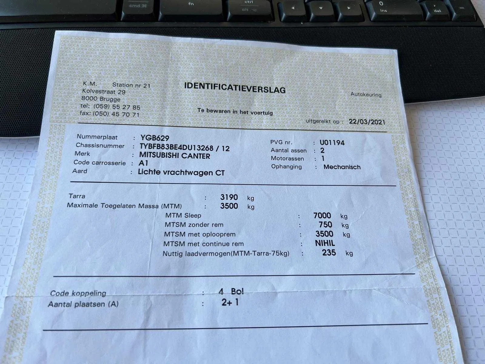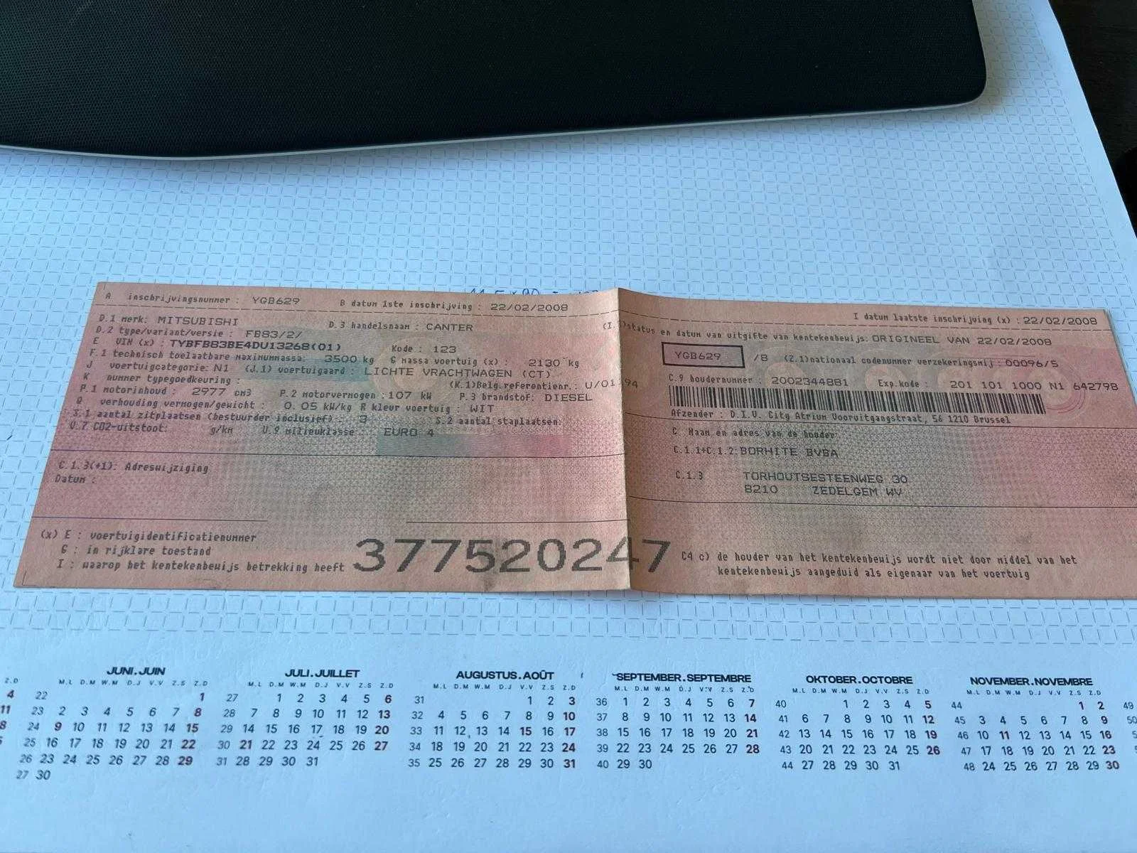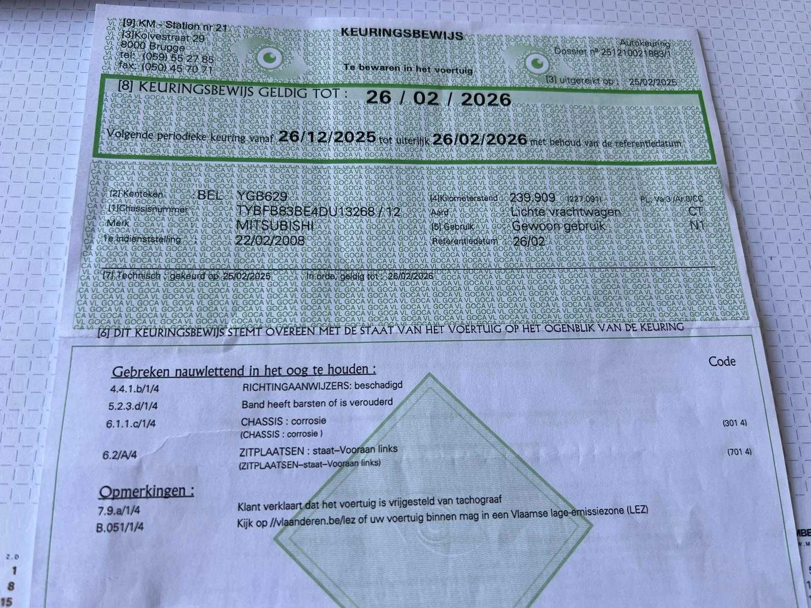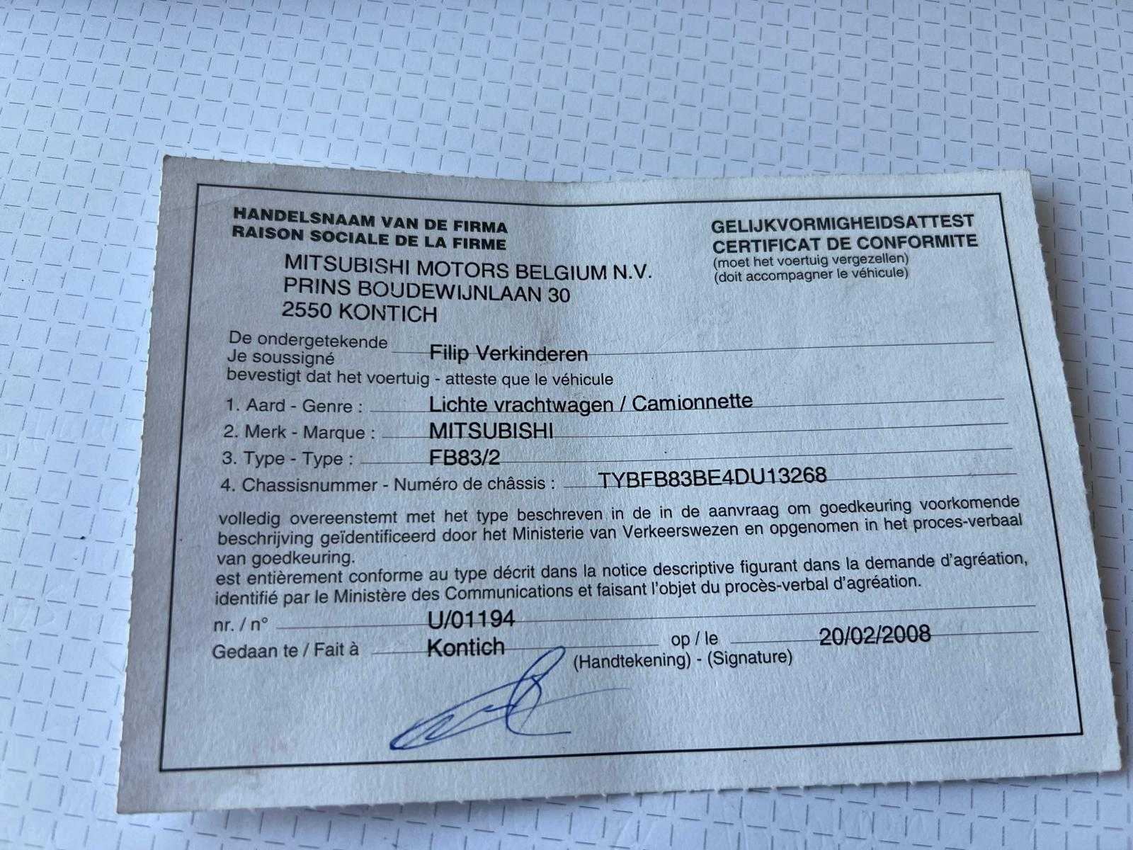 No Merk: Mitsubishi Type: FB832/2 Bouwjaar: 2008 Chassisnummer: TYBFB83BE4DU13268/12 Afgelezen kilometerstand: 242050km Cilinderinhoud: 2977cc Vermogen (kW): 107kW Brandstof: Diesel Datum eerste toelating: 22/02/2008 Transmissie: Handgeschakeld Aantal zitplaatsen: 3 Kleur: Wit Nationaliteit documenten: Belgisch Carrosserie: Lichte vrachtwagen Emissieklasse: Euro 4 Kentekenpapieren compleet?: true CVO verklaring: true Boorddocumenten aanwezig?: true