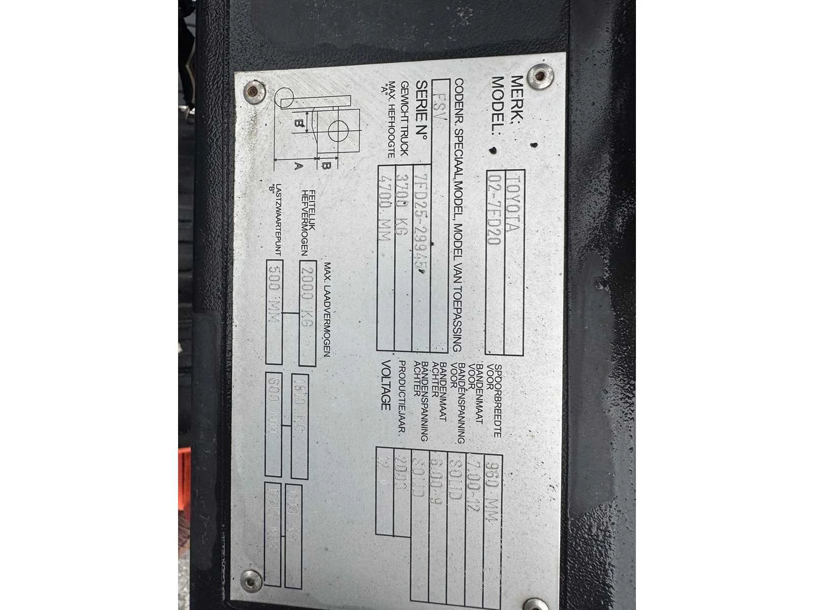 Hydraulisch systeem moet nagekeken worden. bouwjaar 2003 aantal uren 4185 No Merk: Toyota Bouwjaar: 2003 Serienummer: 7FD25-29945 Brandstof: diesel Afgelezen urenstand: 4185 Eigen gewicht: 3700kg Max. hefhoogte: 4700mm