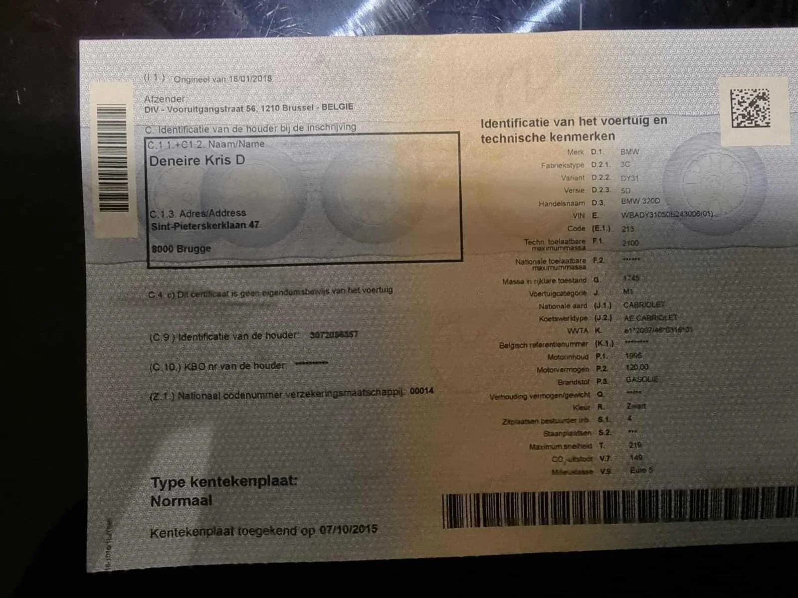 No Merk: BMW Model: DY31 Type: 3C Bouwjaar: 2010 Afgelezen kilometerstand: 124507km Cilinderinhoud: 1995cc Vermogen (kW): 120kW Brandstof: Diesel Chassisnummer: WBADY31050E243006 Datum eerste toelating: 20/05/2010 Aantal zitplaatsen: 4 Kleur: Zwart Transmissie: automaat Emissieklasse: Euro 5 Aantal deuren: 2 Carrosserie: Cabriolet Nationaliteit documenten: Belgisch Gelijkvormigheidsattest aanwezig: true Vavato voert geen technische keuring uit.: true Leder bekleed: true Inschrijvingsbewijs - deel 1 : Aanwezig Inschrijvingsbewijs - deel 2: aanwezig