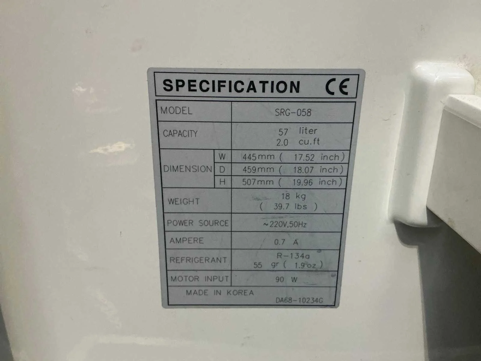Nee Merk: Samsung Model: SRG-058 Deur opent naar: Rechts Totaal netto inhoud: 57l Spanning: 220V Gewicht: 18kg Breedte: 45cm Hoogte: 50cm
