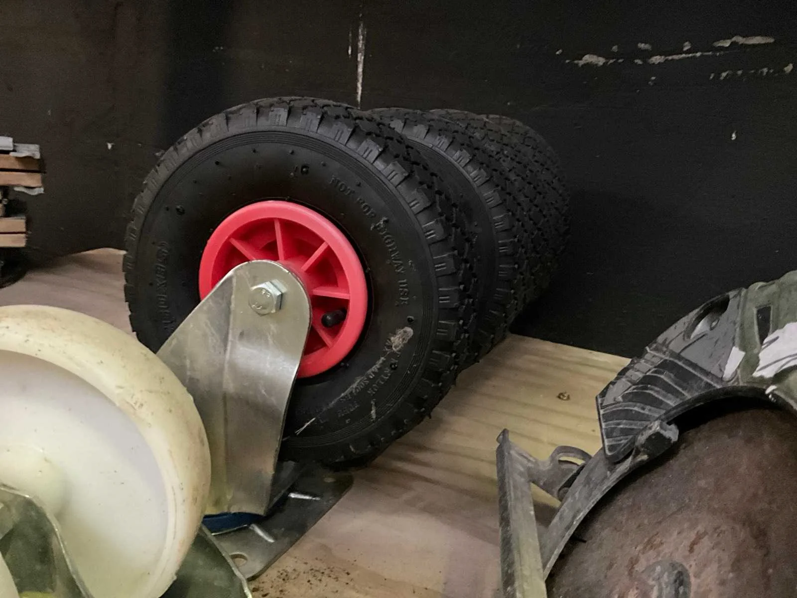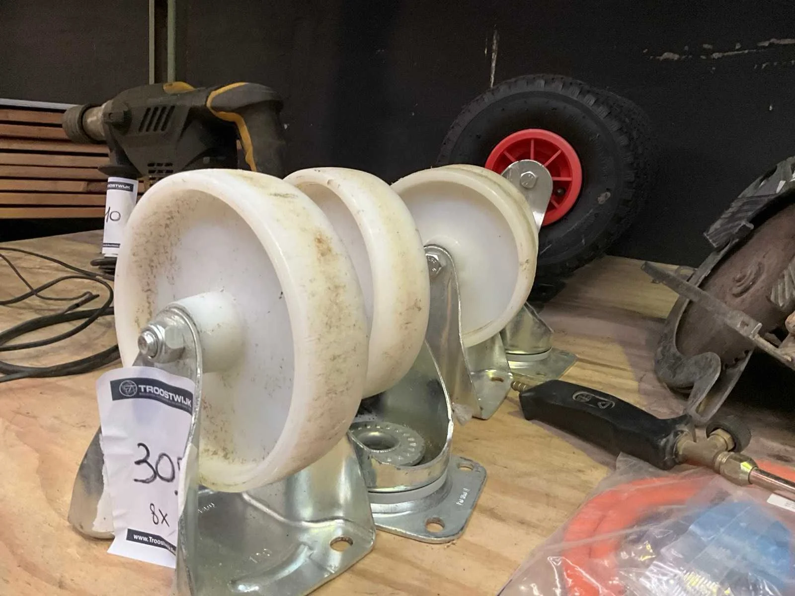 Bestaand uit 4x kunststof wiel diameter 15 cm met 2x zwenkbok +2x vast, + 4x zwenkwiel met luchtband diameter 25 cm Nee
