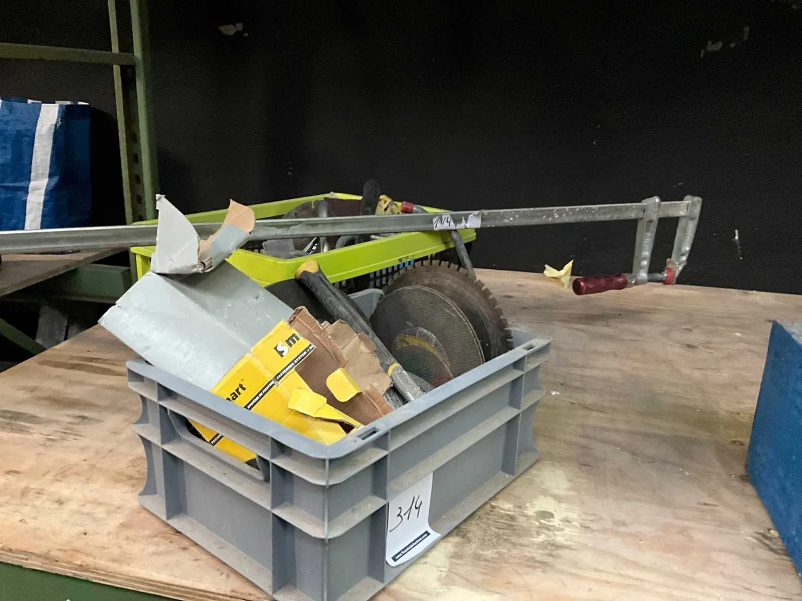 Bestaand uit handgereedschap, spanvijs lengte circa 150 cm, zaagbladen en schijven, box met diversen Nee