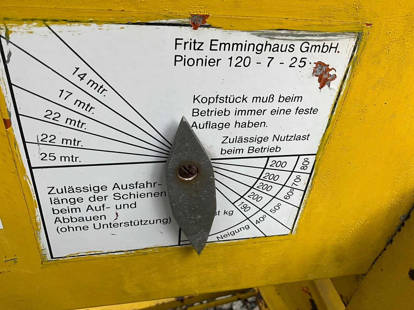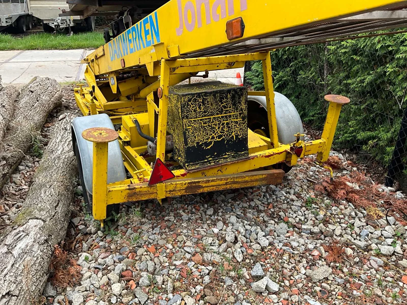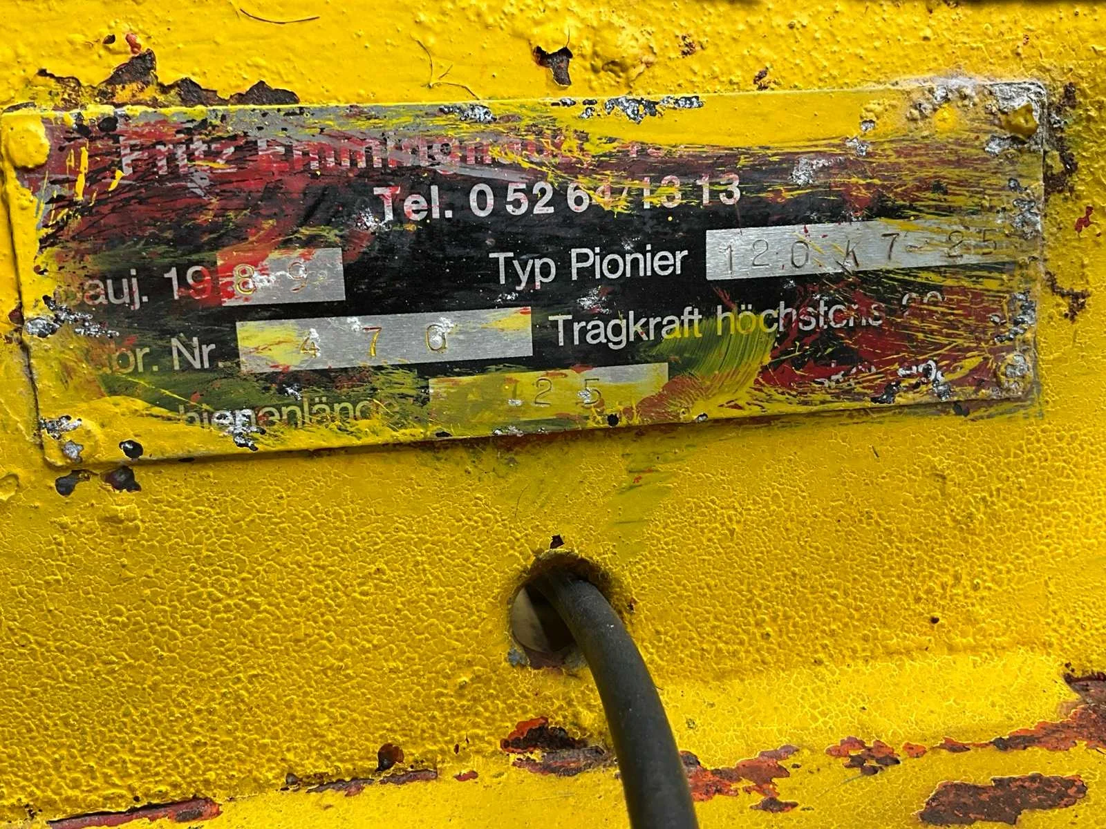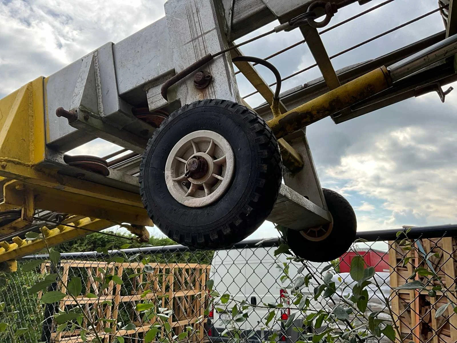 Voorzien van 1-cilinder benzinemotor, hydraulische aansturing, boltrekhaak, zonder verdere gegevens Nee Merk: Fritz Emminghaus Type: T20K7-85 Serienummer: 470 Max. platformhoogte: 25m Max. belasting: 200kg Plateau afm. l: 470mm Plateau afm. b: 1170mm Brandstof: Benzine Totale afmeting L: 8500mm Totale afmeting Breedte: 1800mm Totale afmeting Hoogte: 2500mm