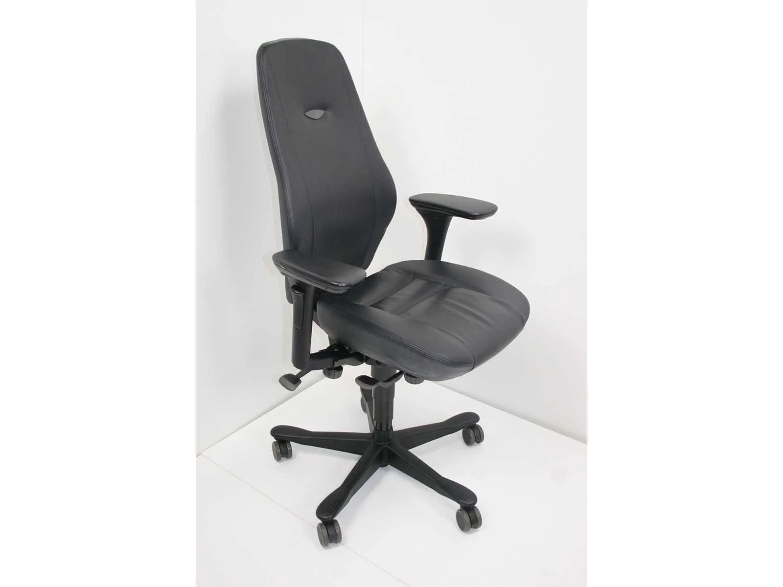 Stervoet in kunststof kleur Zwart voorzien van PHD wielen (ook voor delicate ondergrond), bekleding in leder kleur Zwart, in hoogte verstelbaar, in hoogte verstelbare hoge rugleuning, fixeerbaar freefloat/synchroon mechanisme, instelbare zitdiepte, 3 D armleuningen met softpads , absolute ergonomische top stoel, lichte gebruikssporen mogelijk, foto's indicatief maar stoel is schoongemaakt, nagekeken en heeft technisch onderhoud gehad, foto's indicatief No Merk: Kinnarps Type: Plus(6) Kleur: Zwart Gewicht: 40kg Breedte: 70cm Hoogte: 120cm Diepte: 70cm Materiaal: Metaal, aluminium, kunststof, leder
