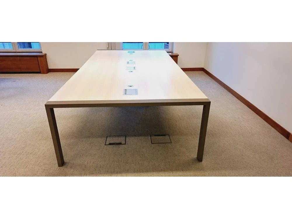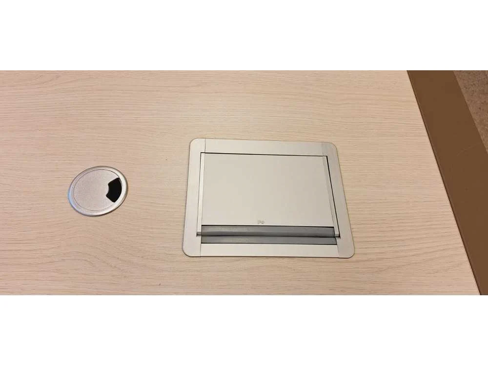 Bladen in melamine kleur Ahorn voorzien van 2 x elektrificatie, onderstel in metaal kleur Antraciet voorzien van kabelgoten, afm. 3200 x 1600 x 740 mm (l x d x h), in zeer goede staat, foto's indicatief No Merk: Ahrend Kleur: Antraciet-Ahorn Gewicht: 150kg Lengte: 320cm Hoogte: 74cm Materiaal: Metaal, aluminium, kunststof, hout, melamine Diepte: 160cm
