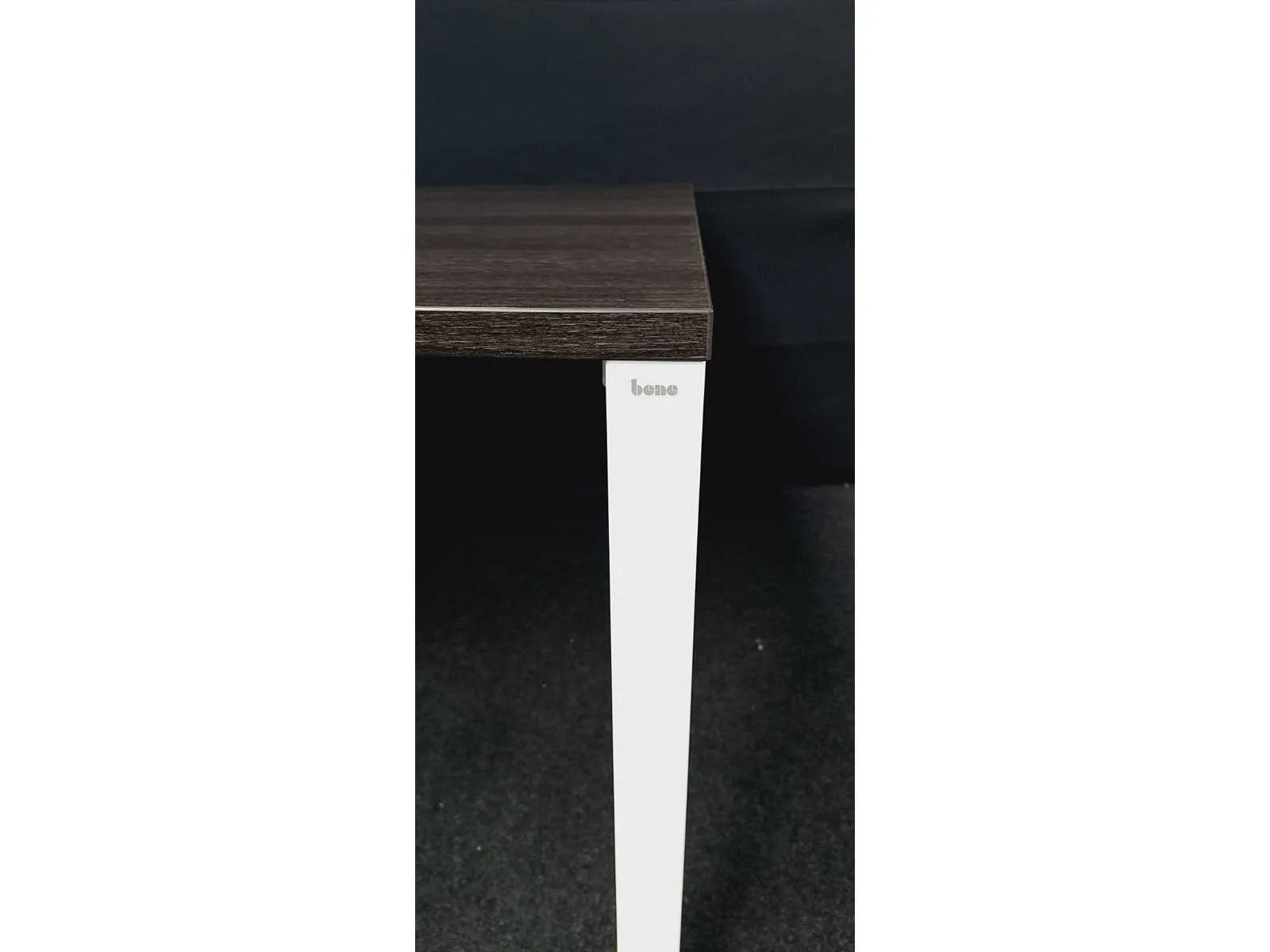 Onderstel in metaal kleur wit, werkblad in melamine kleur antraciet eik, toonzaal model dus in zeer goede staat No Merk: Bene Kleur: wit - antraciet eik Gewicht: 50kg Lengte: 120cm Breedte: 120cm Hoogte: 73cm Materiaal: Metaal, aluminium, hout, melamine