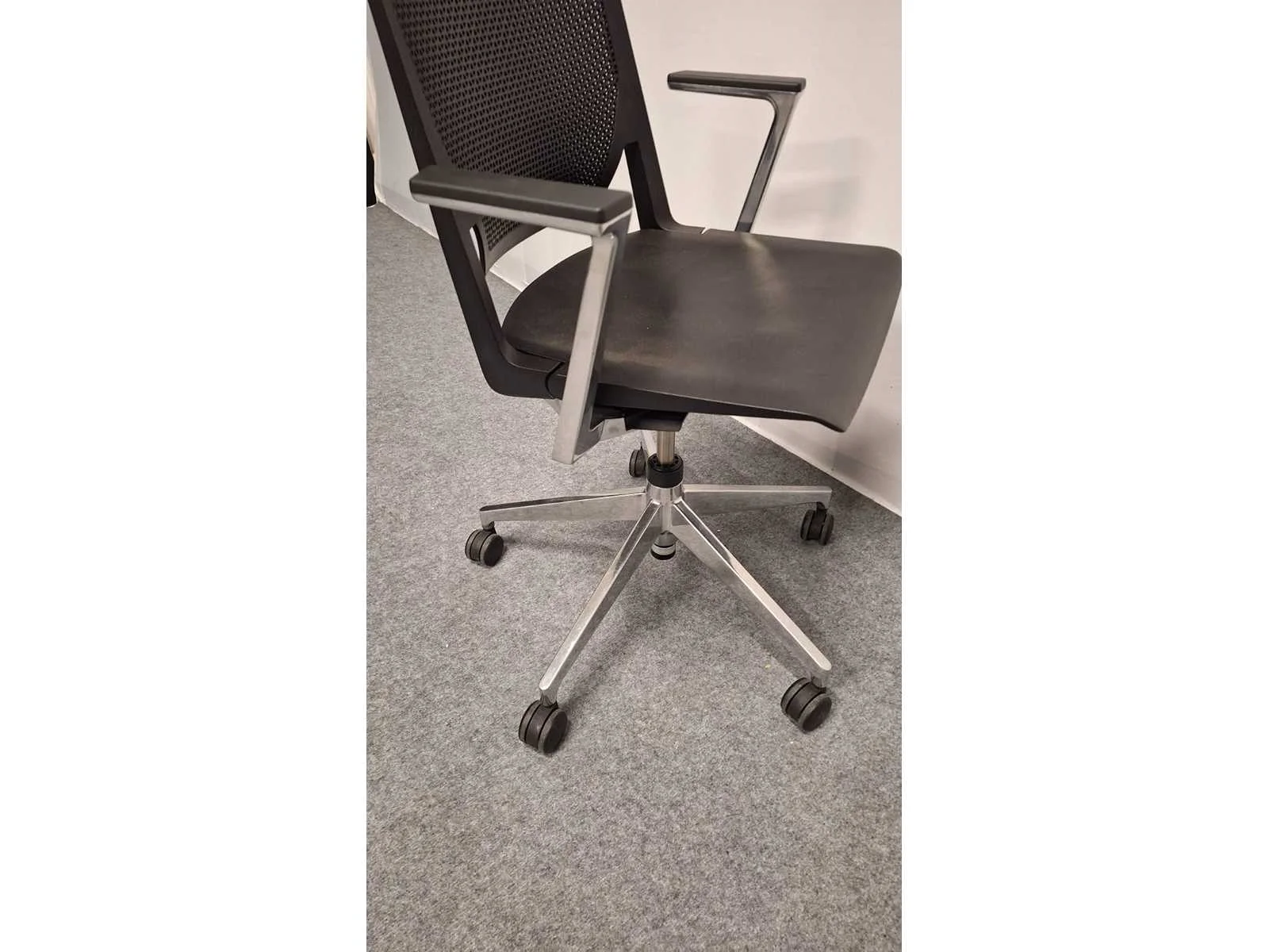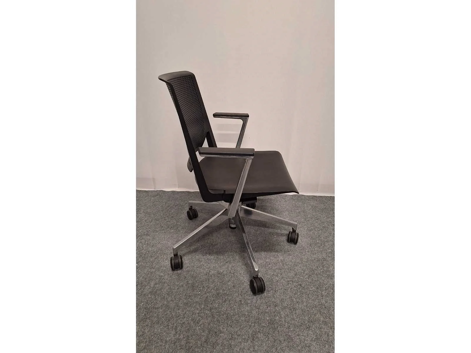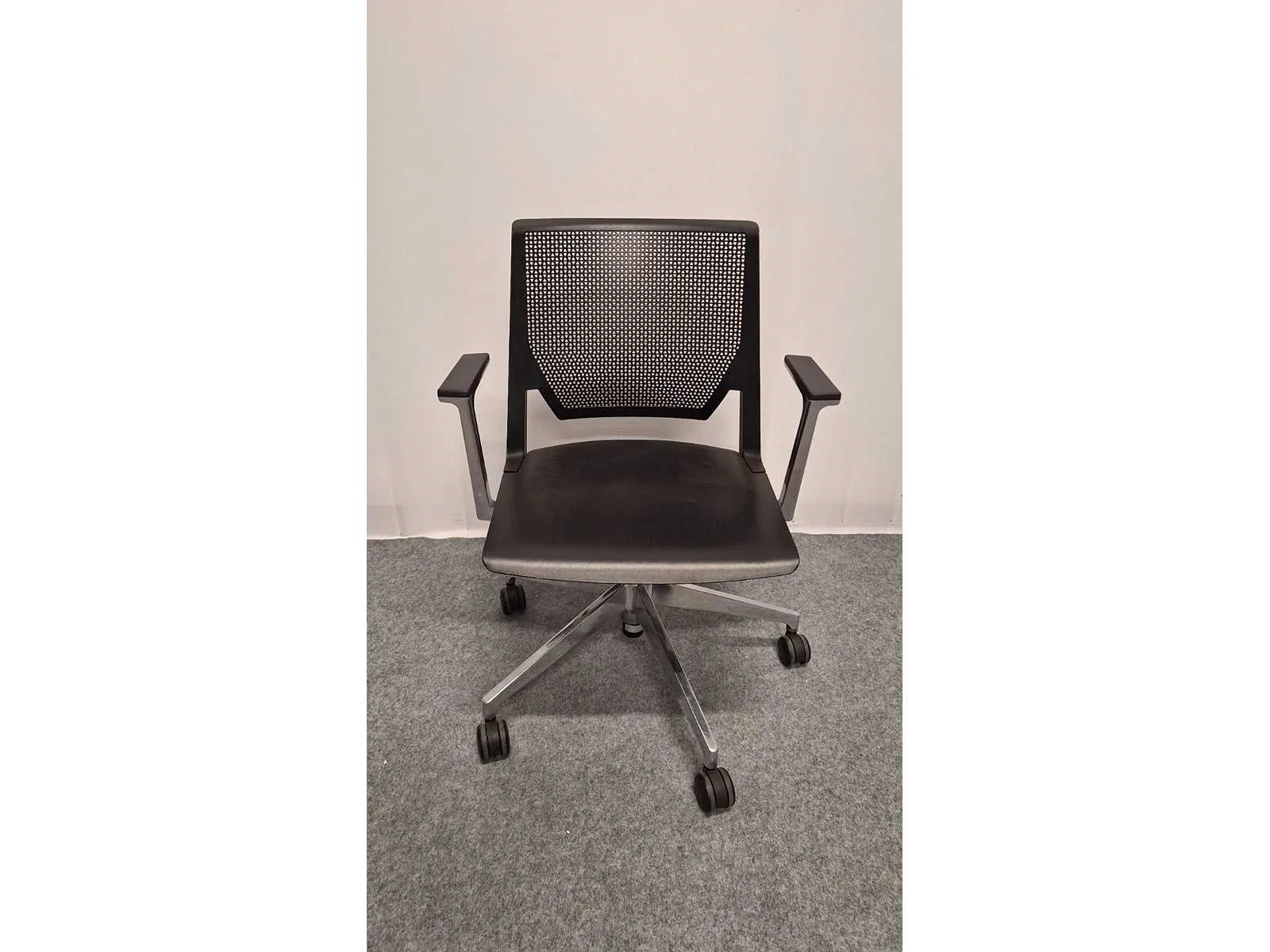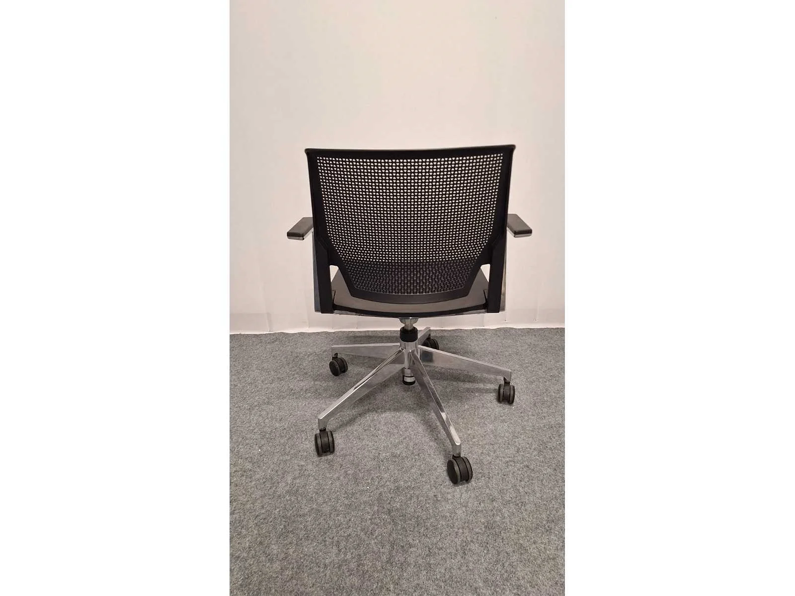 Voetkruis in gepolijst aluminium voorzien van multifunctionele zwenkwielen, armleuningen in gepolijst aluminium voorzien van kunststof leggers kleur Zwart, zitting en rugleuning in kunststof kleur Zwart, mooie design vergadertafel stoel uit hoogwaardige materialen samengesteld, gebruikssporen aanwezig No Merk: Haworth Kleur: alu-zwart Materiaal: Aluminium, metaal, kunststof Zithoogte: 41-51cm Hoogte: 880cm Breedte: 65cm Diepte: 55cm Gewicht: 200kg