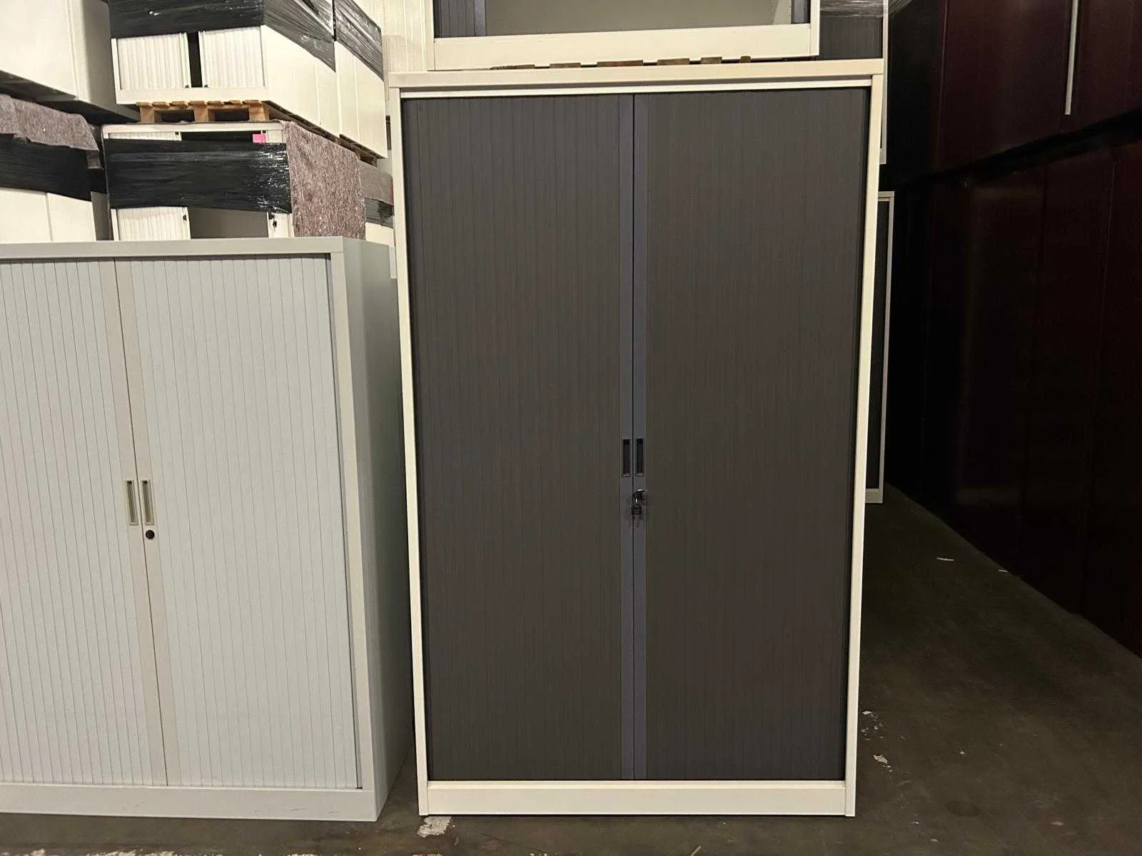 Kast volledig in metaal kleur alu, rolluiken in kunststof kleur antraciet, uitgerust met 4 legplanken, afm. 1980 x 1200 x 470 mm (h x b x d), in goede staat enkel wat verkleuring door UV inwerking; foto's indicatief No Merk: Mewaf Kleur: Beige - Antaciet Gewicht: 80kg Breedte: 120cm Hoogte: 198cm Materiaal: Metaal, kunststof Diepte: 47cm Aantal laden: 4
