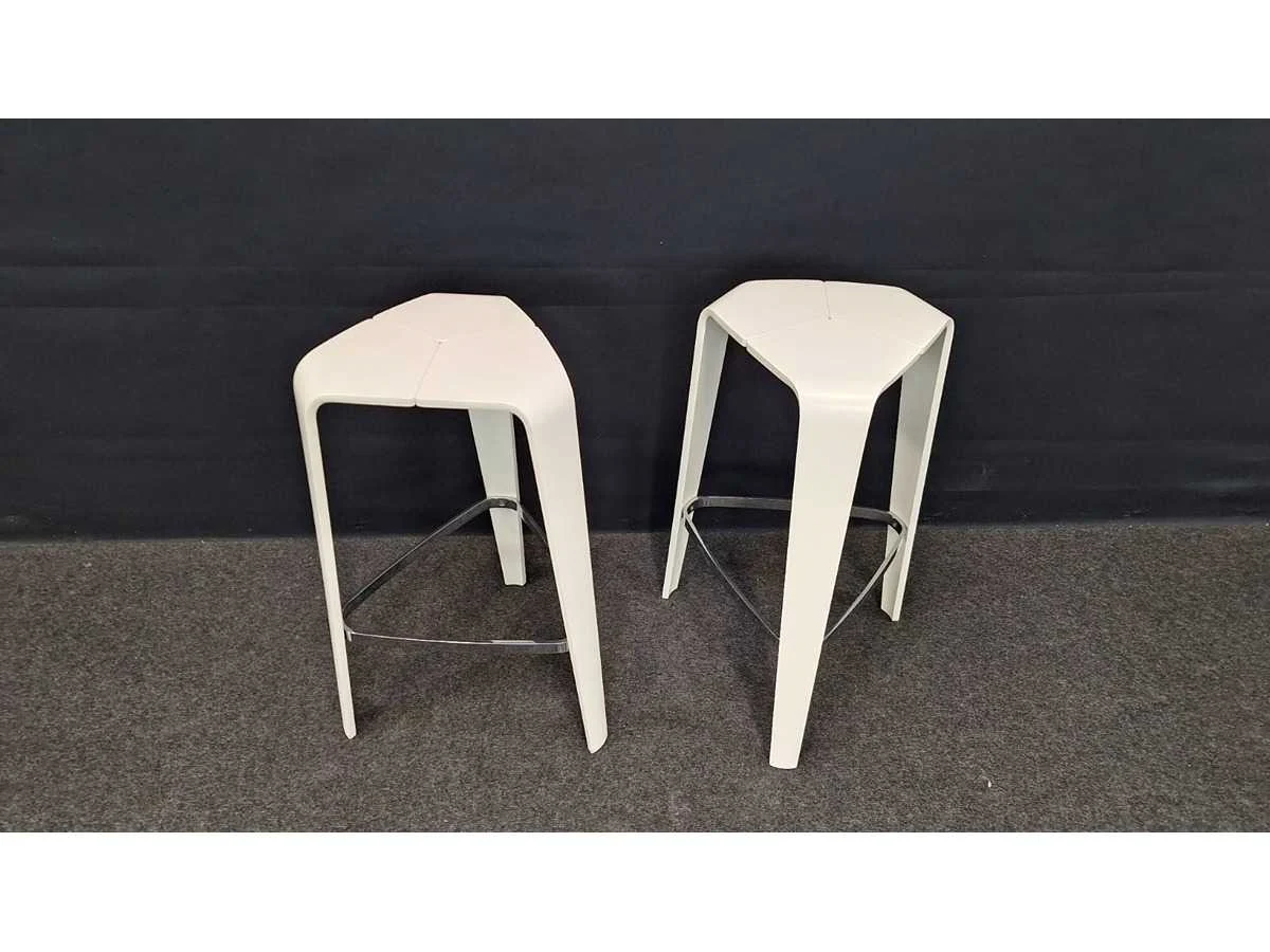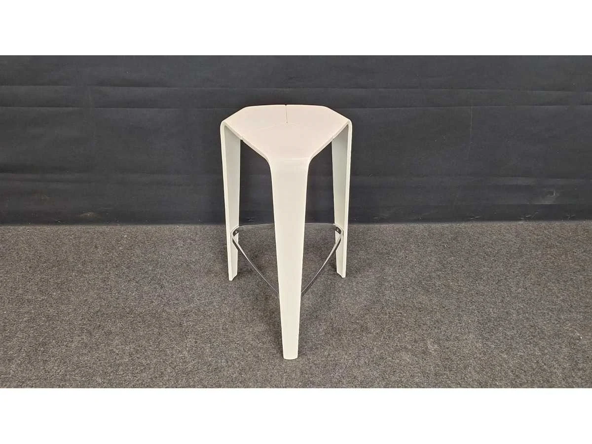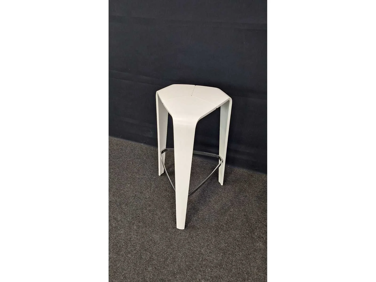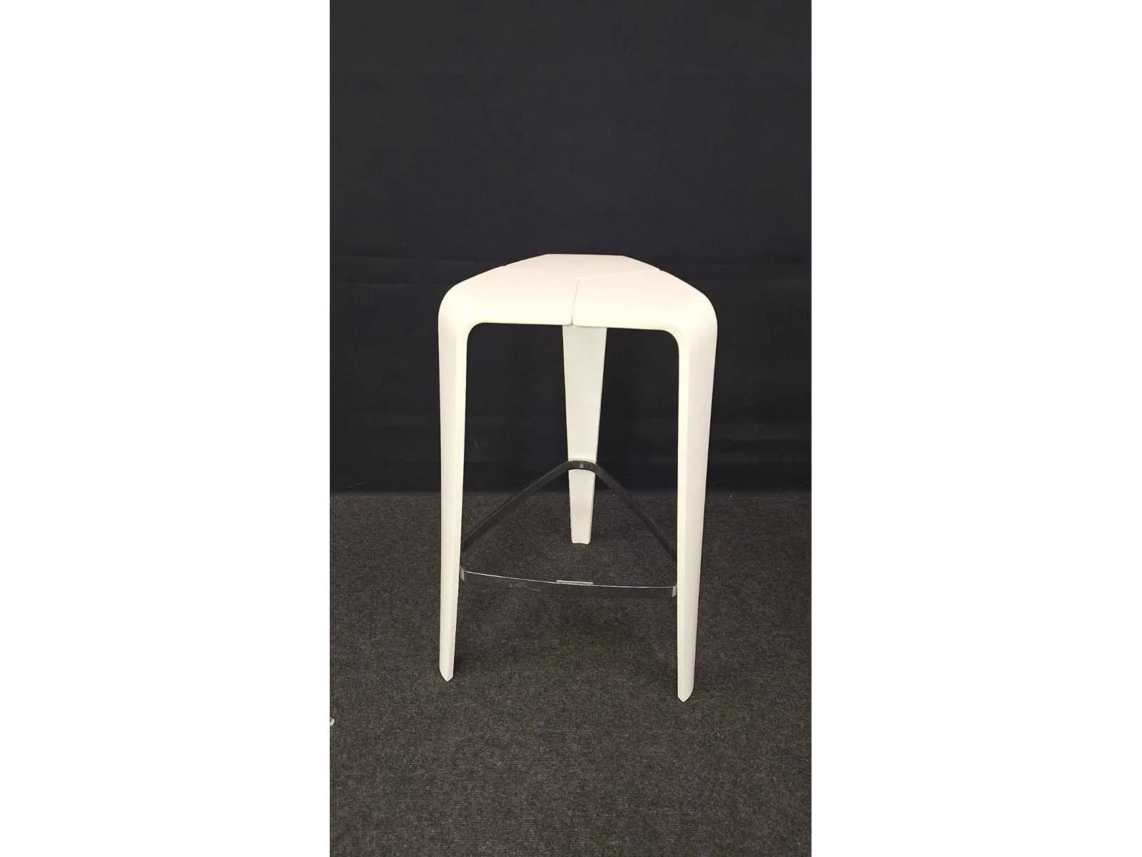 4 stuks design barkruk volledig in gelakt hout kleur Wit, voorzien van voetsteun in metaal hoogglans verchroomd, lichte gebruikssporen mogelijk No Merk: Brunner Kleur: Wit Gewicht: 30kg Diameter ca.: 37 Hoogte: 80cm Materiaal: <Hout, metaal, lak