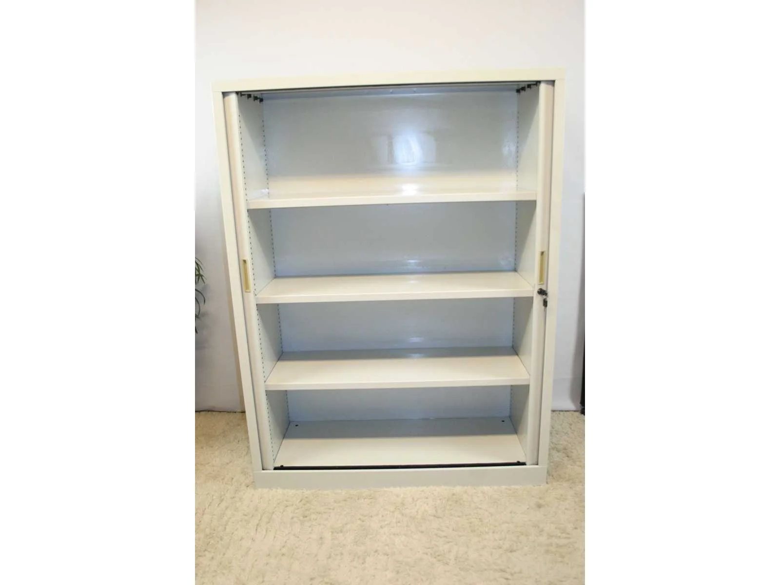 Kast volledig in metaal kleur grijs, roldeuren in kunststof kleur grijs, uitgerust met 3 legplanken in metaal kleur grijs, lichte gebruikssporen, sleutel niet gegarandeerd No Merk: Robberechts Kleur: Grijs Gewicht: 50kg Breedte: 120cm Hoogte: 160cm Materiaal: Metaal, kunststof, aluminium Diepte: 45cm Aantal laden: 3