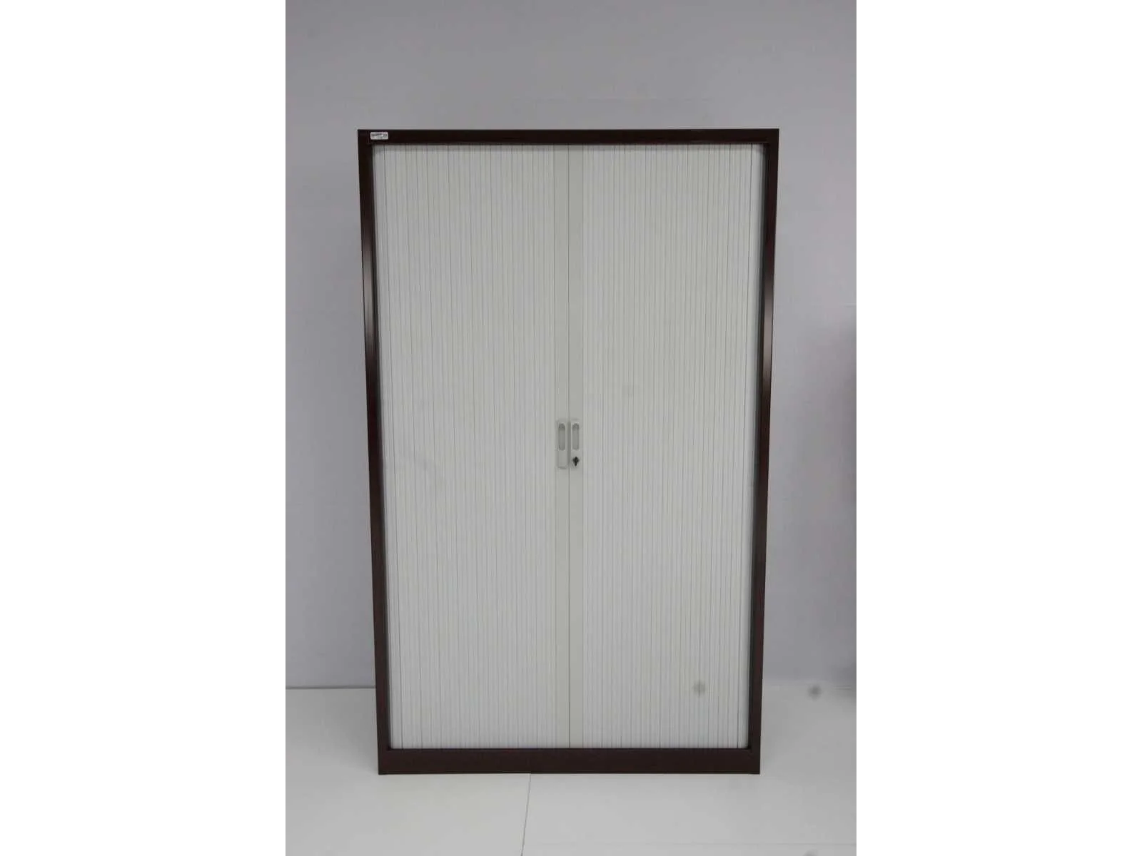 Frame volledig in metaal kleur Bordeauxrood, rolluiken in kunststof kleur wit, uitgerust met 4 legplanken, lichte gebruikssporen mogelijk No Merk: Pami Kleur: bordeaurood-wit Gewicht: 80kg Breedte: 120cm Hoogte: 198cm Materiaal: metaal, kunststof Diepte: 46cm Aantal laden: 4