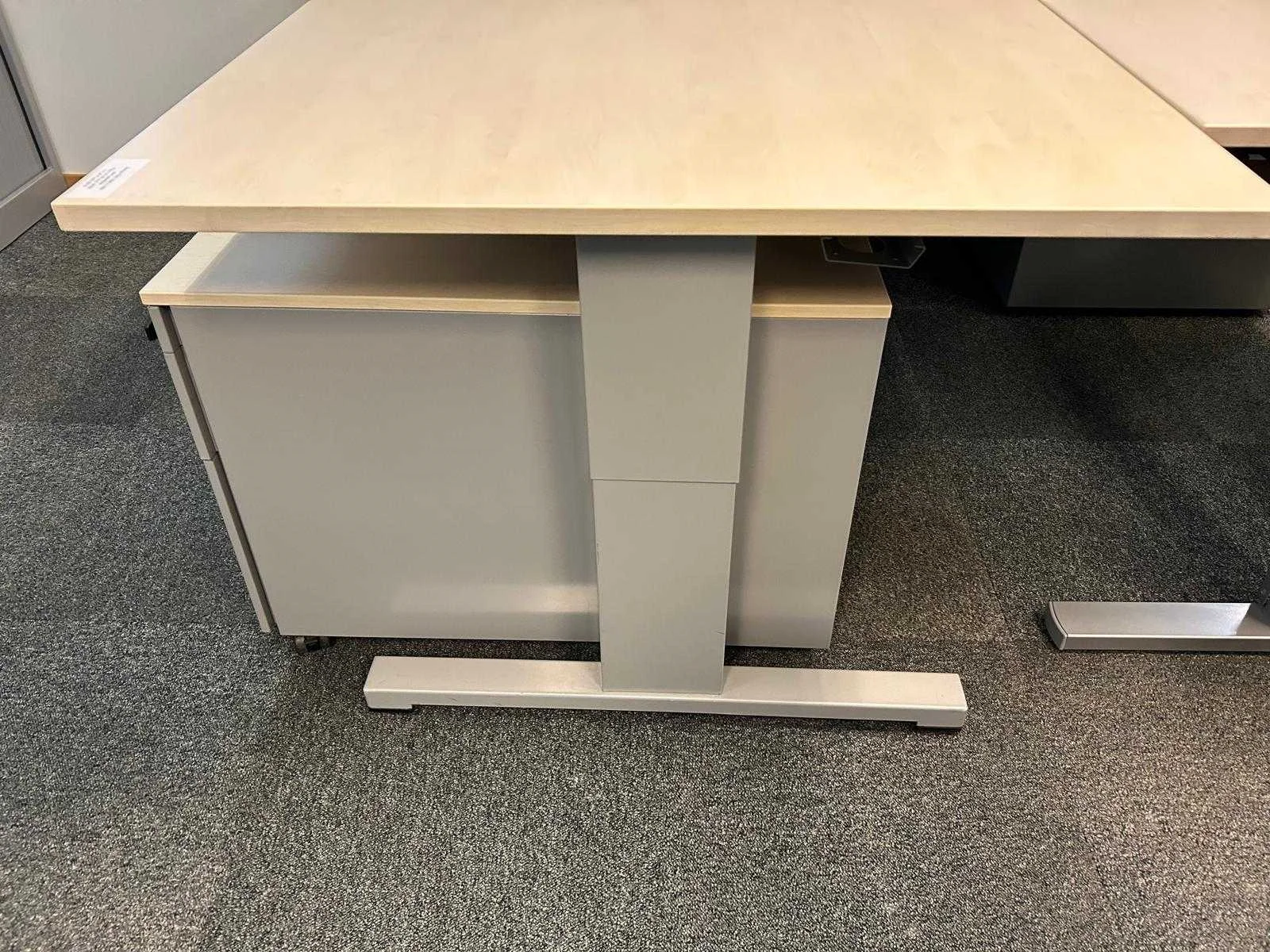 In hoogte verstelbaar (620 - 820 mm) onderstel in metaal kleur alu, werkblad in melamine kleur esdoorn, in zeer goede staat, inclusief bijpassend ladenblok Pami in metaal kleur alu voorzien van top in melamine kleur esdoorn, 1dossierlade + 1 gewone lade + 1 pennenlade, in goede staat, foto's indicatief. No Merk: Pami Kleur: alu-esdoorn Gewicht: 320kg Lengte: 180cm Hoogte: 62-82cm Materiaal: metaal, aluminium, kunststof, hout, melamine Diepte: 100cm