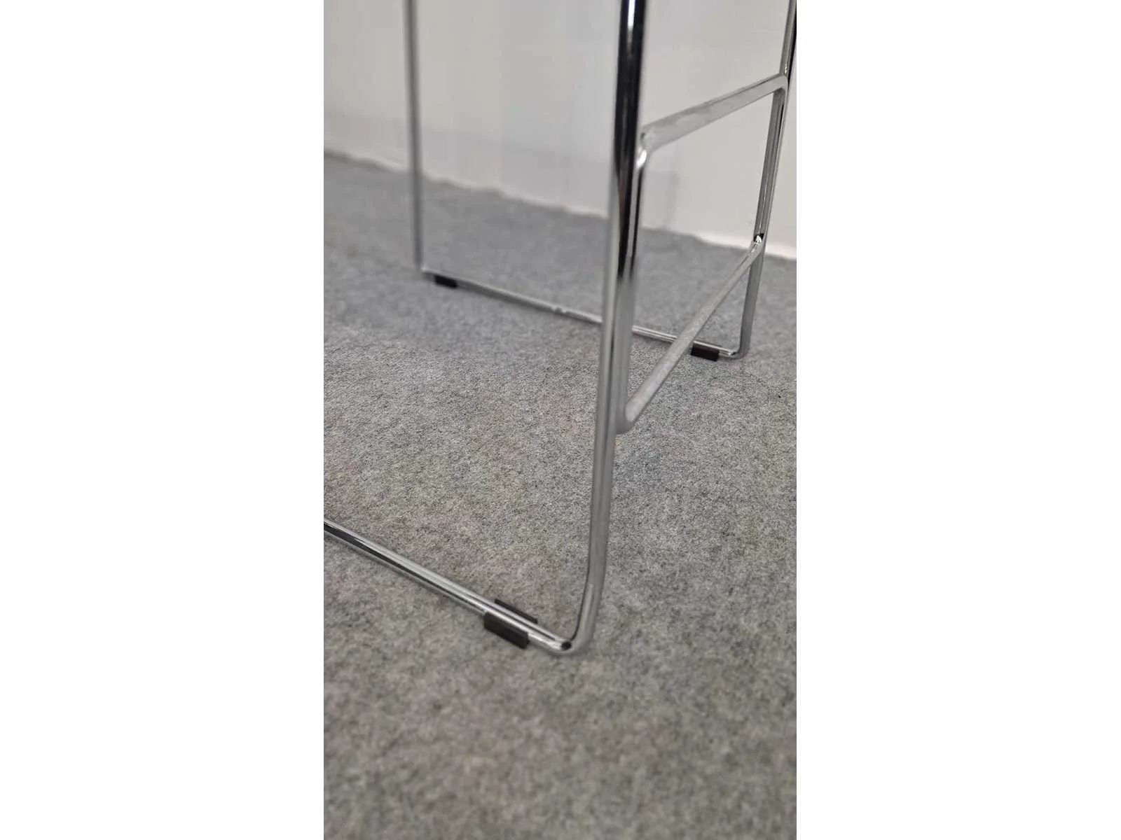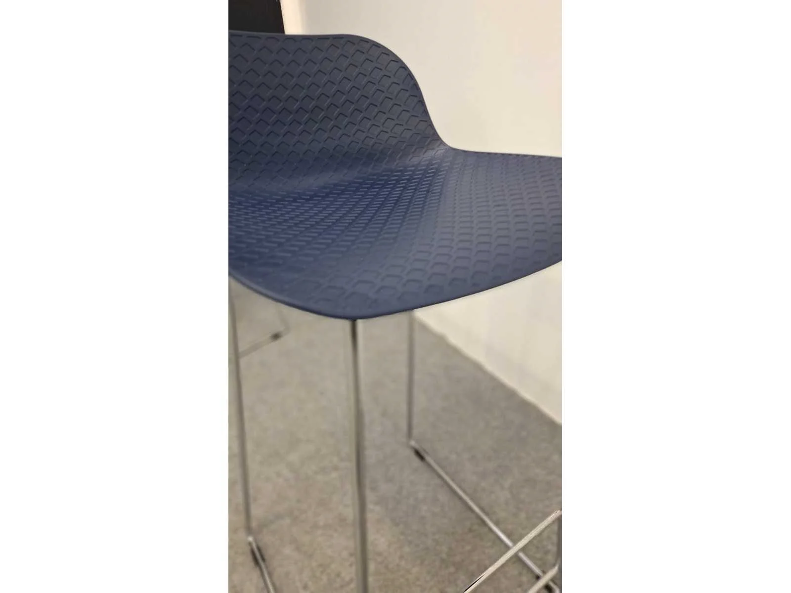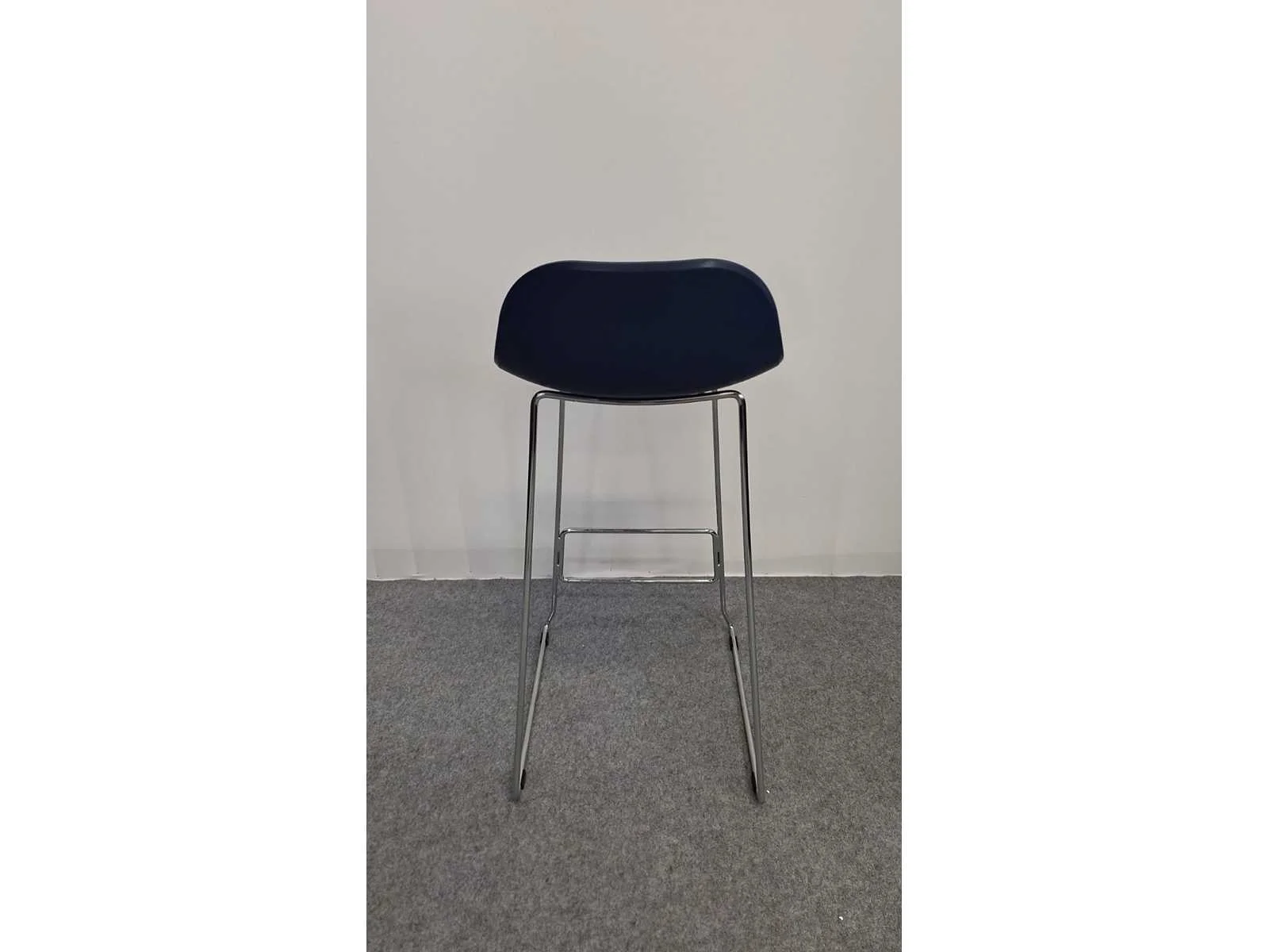 Vierpootsonderstel in metaal hoogglans verchroomd, schaal in kunststof kleur Blauw, zithoogte 770 mm, in zeer goede staat No Merk: NN Kleur: Chrome - Blauw Lengte: 43cm Breedte: 43cm Hoogte: 95cm Materiaal: Metaal, chroom, kunststof