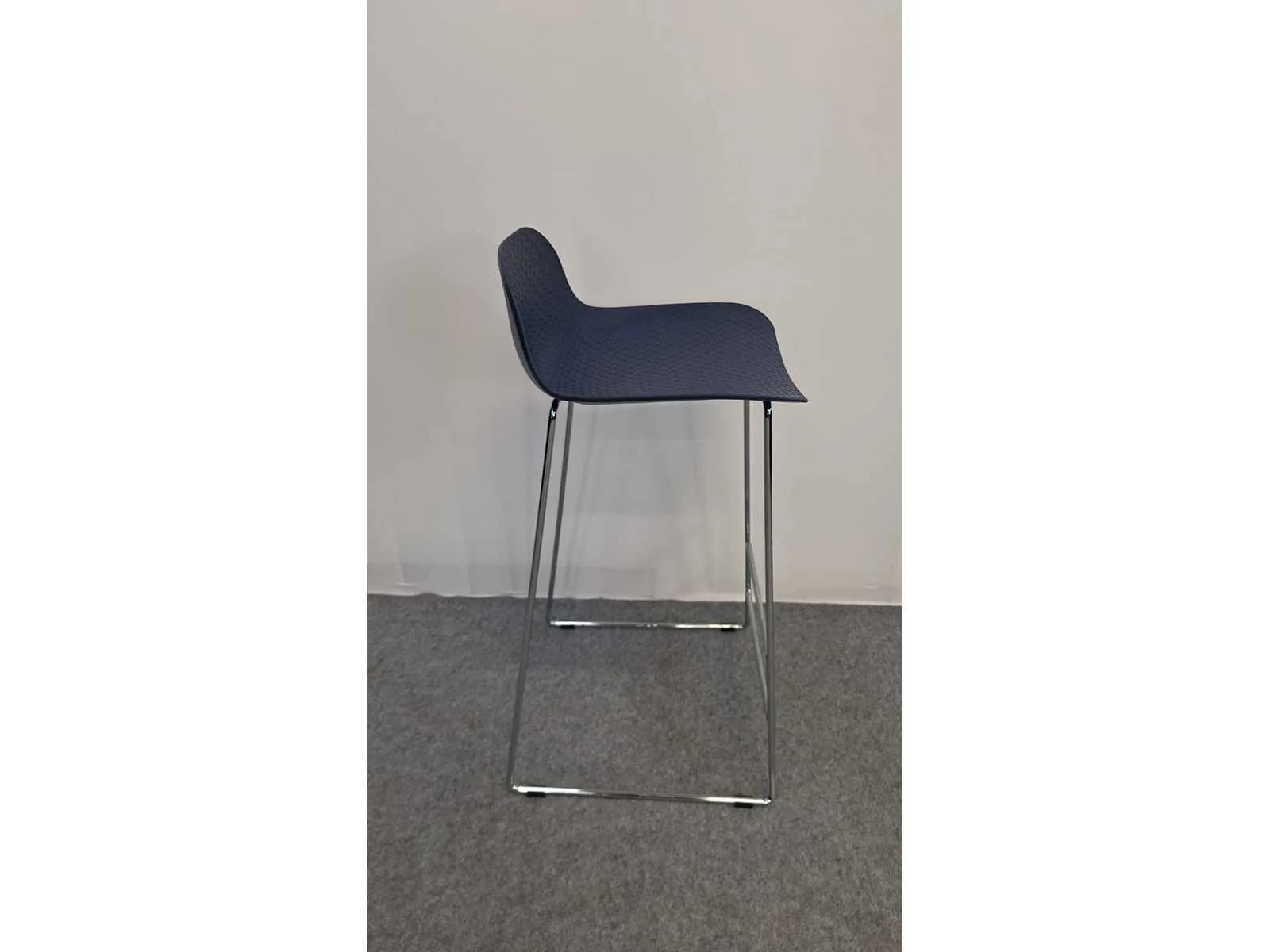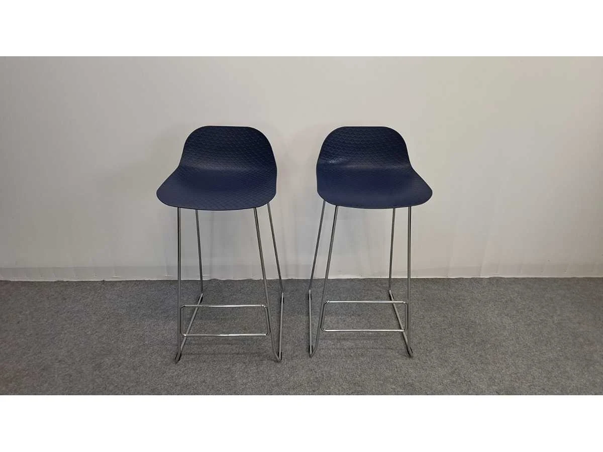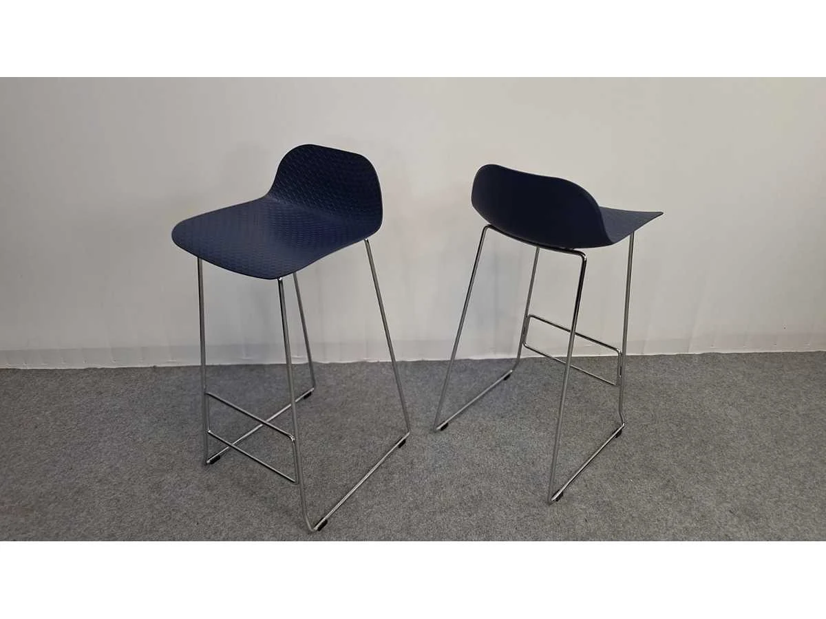 Vierpootsonderstel in metaal hoogglans verchroomd, schaal in kunststof kleur Blauw, zithoogte 770 mm, in zeer goede staat No Merk: NN Kleur: Chrome - Blauw Lengte: 43cm Breedte: 43cm Hoogte: 95cm Materiaal: Metaal, chroom, kunststof