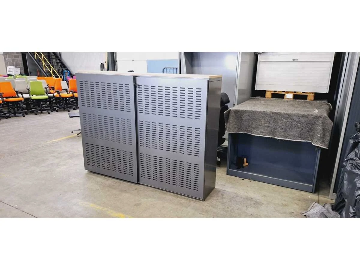 Kast volledig in metaal kleur antraciet, top in melamine kleur Havanna, geperforeerde deuren met akoestische vulling, 3 legplanken per zijde, lichte gebruikssporen mogelijk, foto's indicatief. No Merk: Pami Kleur: Antraciet-Havanna Gewicht: 150kg Breedte: 200cm Hoogte: 152cm Materiaal: Metaal, aluminium, kunststof, hout, melamine Diepte: 50cm Aantal laden: 6