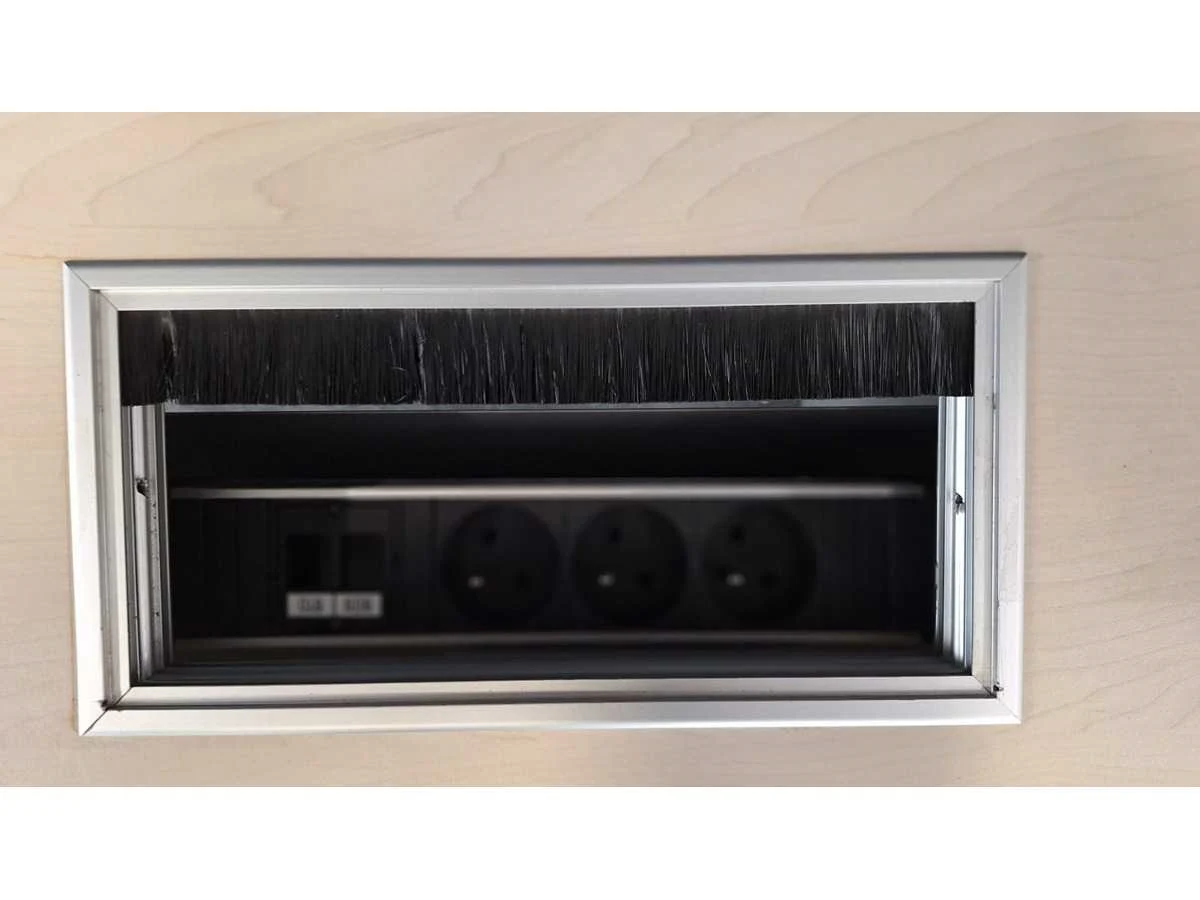Onderstel in metaal kleur Aluminium, blad in melamine kleur Ahorn voorzien van elektrificatie, goede staat, inclusief mobiel ladenblok TDS in metaal kleur alu, uitgerust met 3 lades + pennenlade en top in melamine, lichte gebruikssporen mogelijk, sleutel ontbreekt No Merk: Pami Kleur: Alu-Ahorn Gewicht: 80kg Lengte: 160cm Hoogte: 73cm Materiaal: Metaal, aluminium, hout, melamine, kunststof Diepte: 80cm