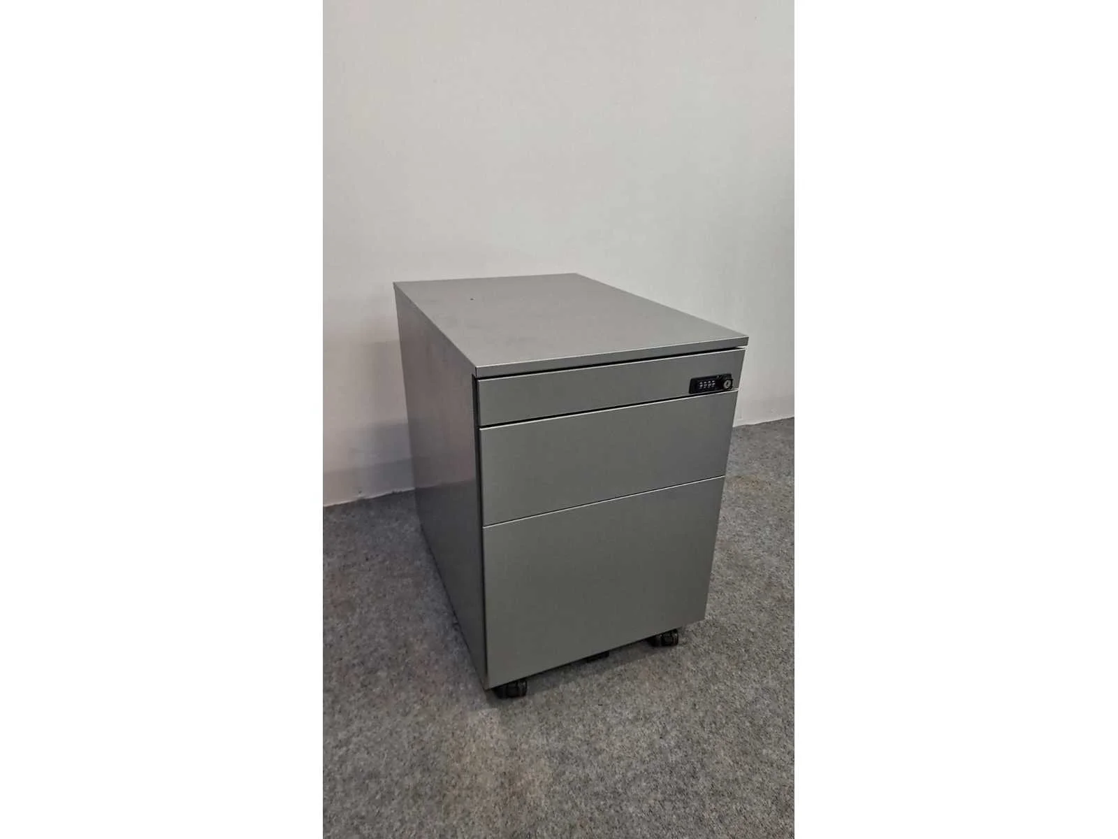 Mobiel ladenblok volledig in metaal kleur Alu, voorzien van 1 dossierlade + 1 gewone lade + 1 pennenlade + cijferslot (code 0000), nieuw in verpakking, geen sleutel No Merk: Drisag Kleur: ALu Gewicht: 25kg Breedte: 42cm Hoogte: 61cm Materiaal: Metaal, kunststof Diepte: 62cm