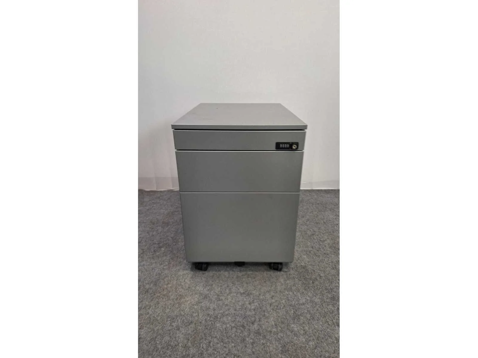 Mobiel ladenblok volledig in metaal kleur Alu, voorzien van 1 dossierlade + 1 gewone lade + 1 pennenlade + cijferslot (code 0000), nieuw in verpakking, geen sleutel No Merk: Drisag Kleur: ALu Gewicht: 100kg Breedte: 42cm Hoogte: 61cm Materiaal: Metaal, kunststof Diepte: 62cm