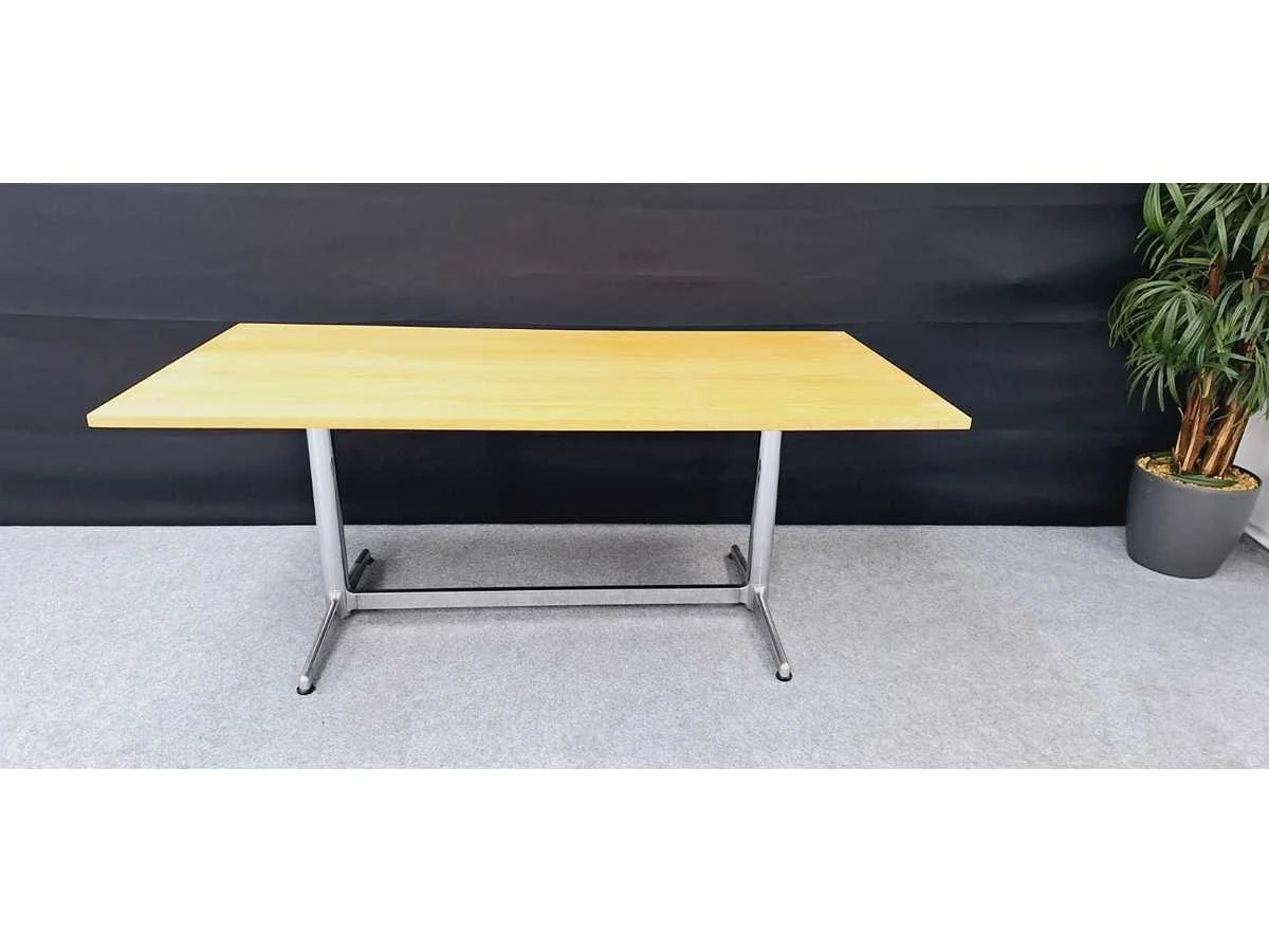 Frame in metaal hoogglans verchroomd, poten in gepolijst aluminium, blad in eikfineer, staat: vintage No Gewicht: 60kg Lengte: 180cm Breedte: 90cm Hoogte: 73cm