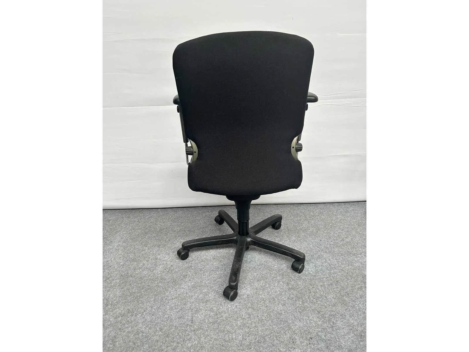 Stervoet in kunststof kleur Zwart voorzien van standaard zwenkwielen, bekleding in stof kleur Zwart, in hoogte verstelbaar, in hoogte verstelbare rugleuning, verstelbare lendesteun, synchromechanisme met gewichtsinstelling, 4D armleuningen met softpads, gebruikssporen aanwezig, foto's indicatief No Merk: Comforto Type: 77 Kleur: Zwart Gewicht: 30kg Breedte: 70cm Hoogte: 100cm Diepte: 70cm Materiaal: Metaal, aluminium, kunststof, stof