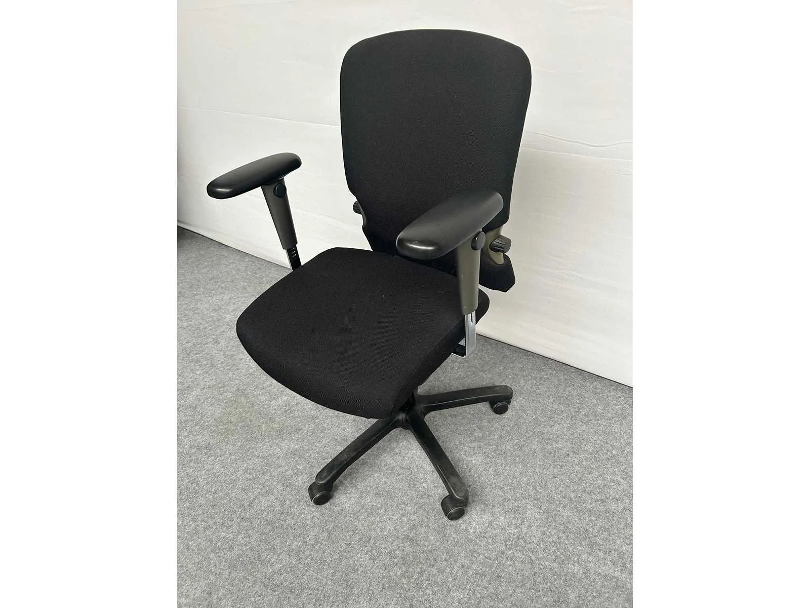 Stervoet in kunststof kleur Zwart voorzien van standaard zwenkwielen, bekleding in stof kleur Zwart, in hoogte verstelbaar, in hoogte verstelbare rugleuning, verstelbare lendesteun, synchromechanisme met gewichtsinstelling, 4D armleuningen met softpads, gebruikssporen aanwezig, foto's indicatief No Merk: Comforto Type: 77 Kleur: Zwart Gewicht: 150kg Breedte: 70cm Hoogte: 100cm Diepte: 70cm Materiaal: Metaal, aluminium, kunststof, stof