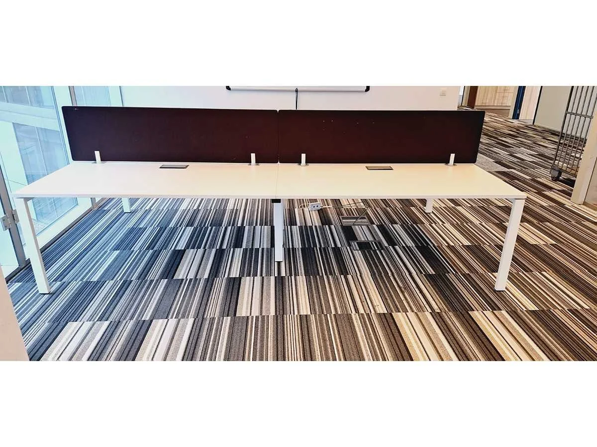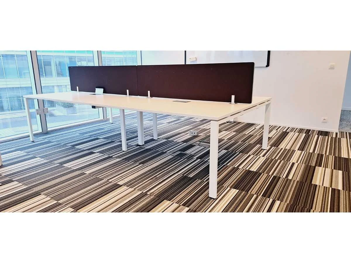 Onderstel in metaal kleur Wit voorzien van kabelgoten, werkbladen in melamine kleur Wit voorzien van kabeldoorvoeren in alu, akoestische scheidingswanden bekleed met stof kleur Zwart, in goede staat stof wandje moet gereinigd worden, afm. 3200 x 1600 x 740 mm (l x d x h) No Merk: Haworth Kleur: Wit Gewicht: 120kg Lengte: 320cm Hoogte: 74cm Materiaal: Metaal, kunststof, aluminium, hout, melamine, stof Diepte: 160cm