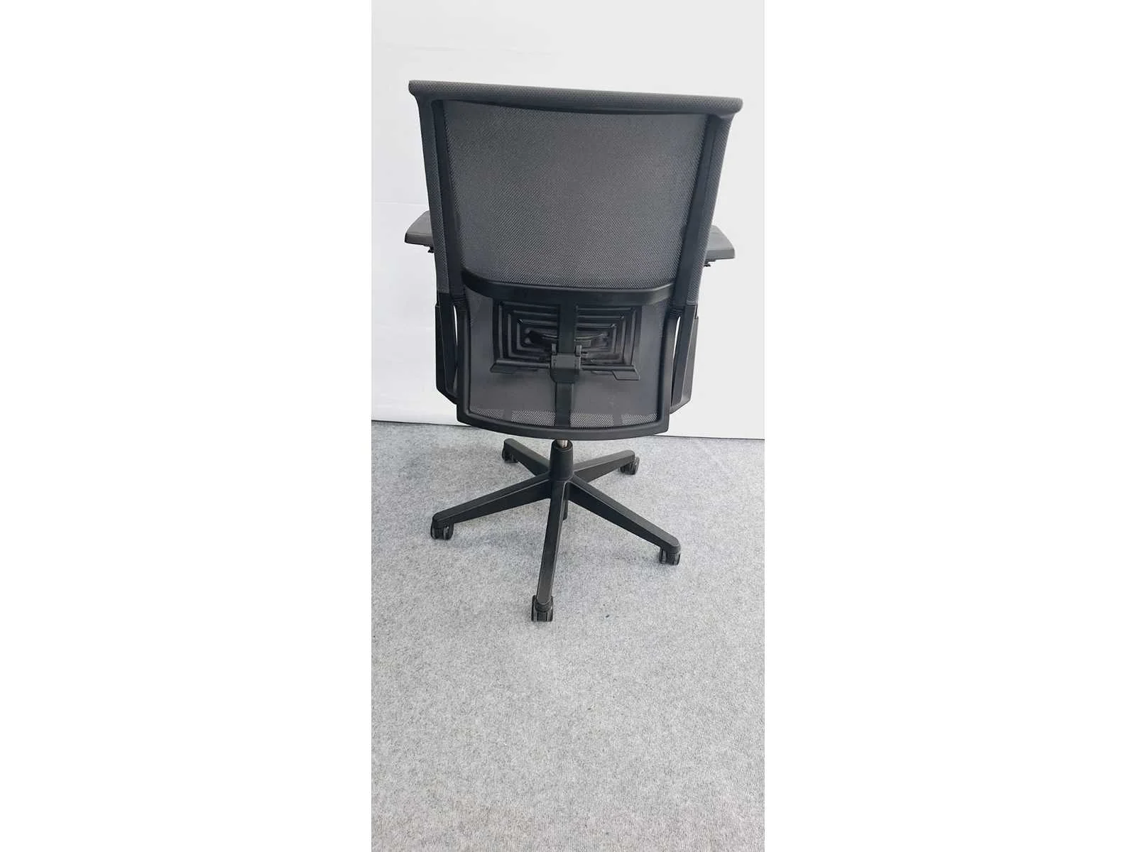 Kruisvoet in kunststof kleur Zwart voorzien van standaard zwenkwielen, zitting bekleed in stof kleur Antraciet, rugleuning in netweave kleur Antraciet, in hoogte verstelbaar, synchromechanisme met gewichtsinstelling, instelbare zitdiepte, verstelbare lende steun, in goede staat maar kleine beschadiging aan netweave (zie foto) No Merk: Haworth Type: System 59 Kleur: Antraciet Gewicht: 30kg Breedte: 70cm Hoogte: 100cm Diepte: 70cm Materiaal: Metaal, kunststof, aluminium, stof