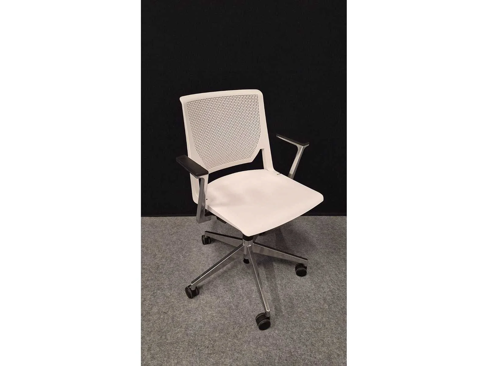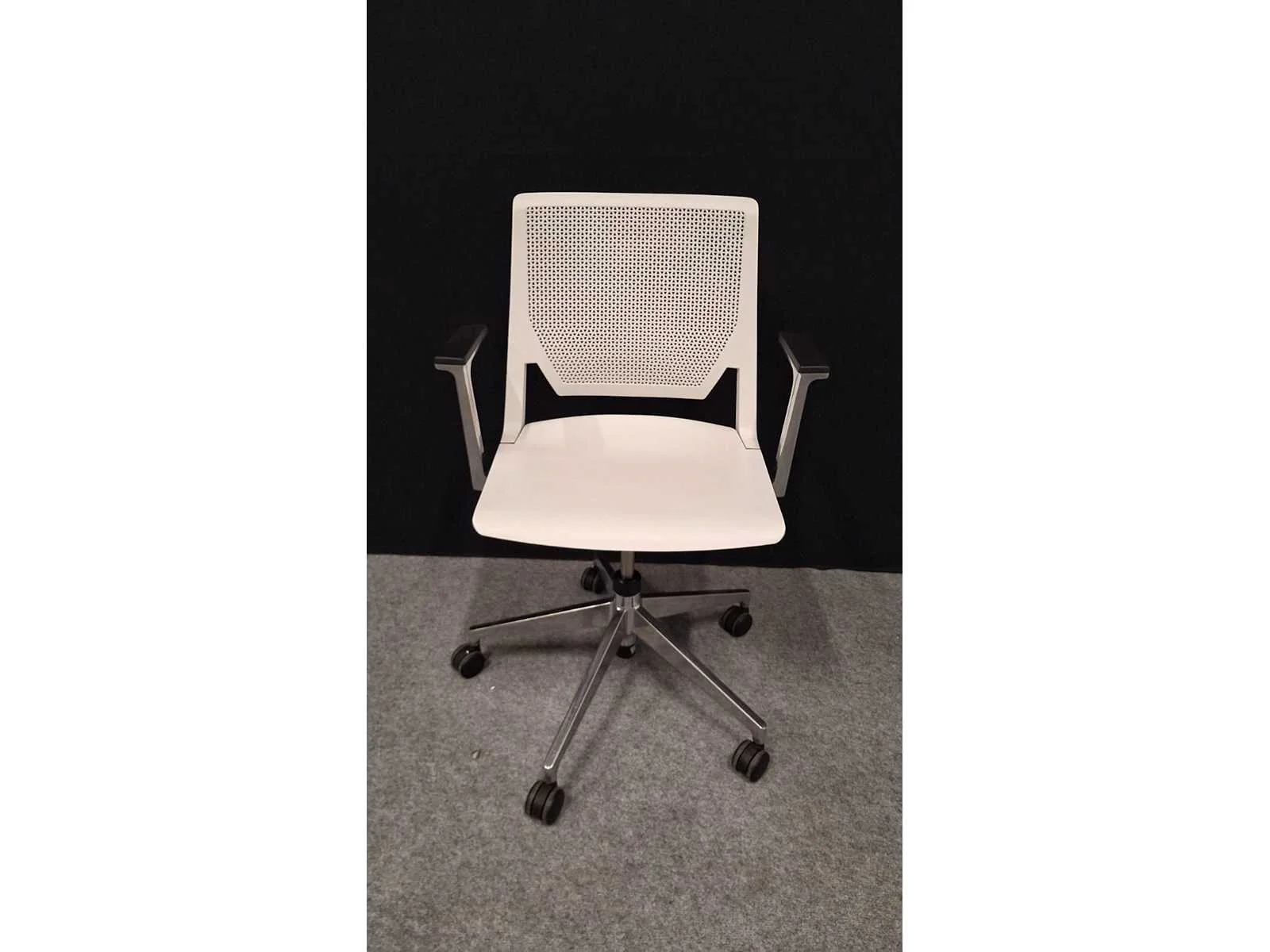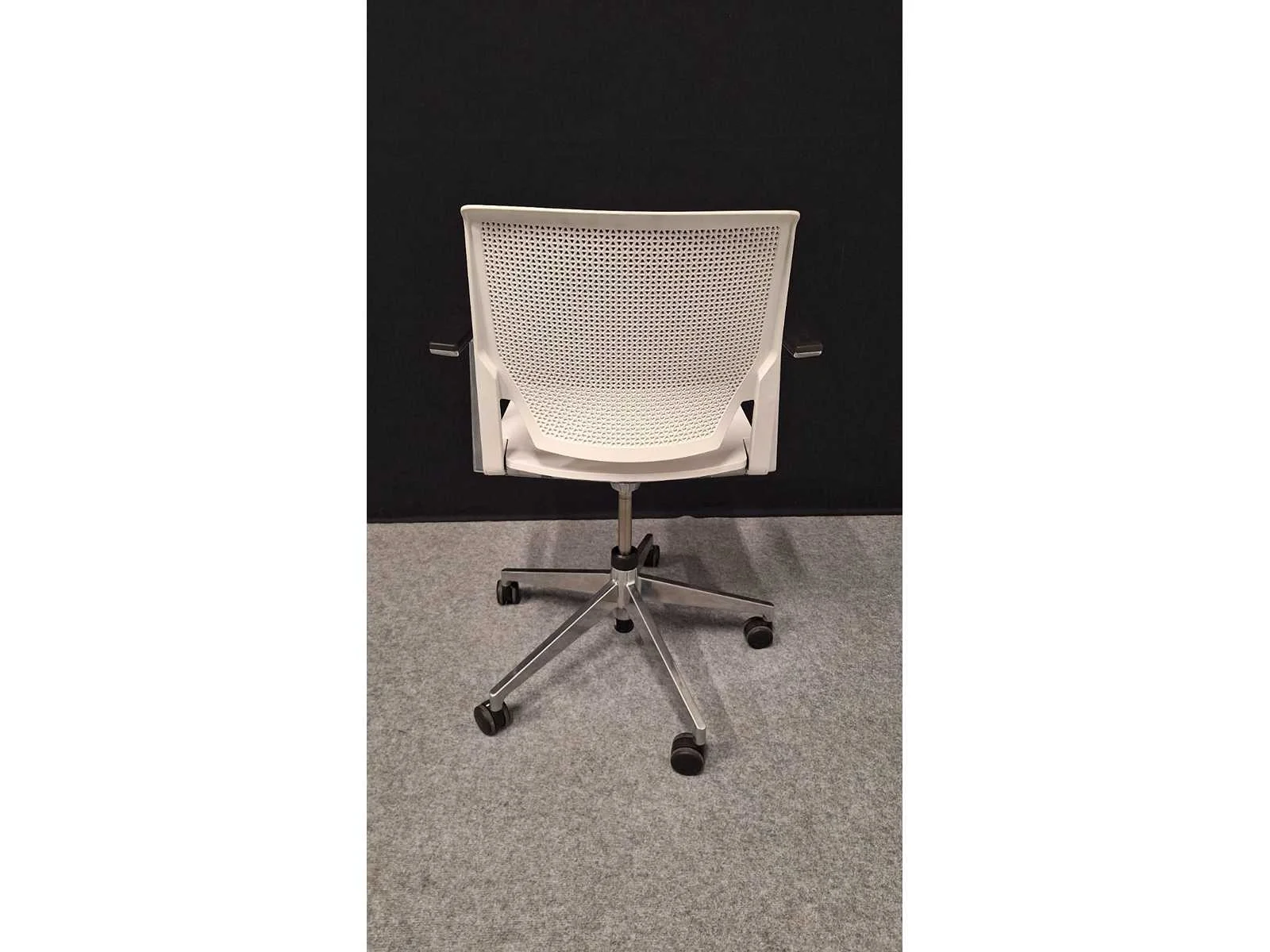 Voetkruis in gepolijst aluminium voorzien van multifunctionele zwenkwielen, armleuningen in gepolijst aluminium voorzien van kunststof leggers kleur Zwart, zitting en rugleuning in kunststof kleur Wit, mooie design vergadertafel stoel uit hoogwaardige materialen samengesteld, gebruikssporen aanwezig No Merk: Haworth Kleur: alu-wit Materiaal: Aluminium, metaal, kunststof Zithoogte: 41-51cm Hoogte: 880cm Breedte: 65cm Diepte: 55cm Gewicht: 40kg