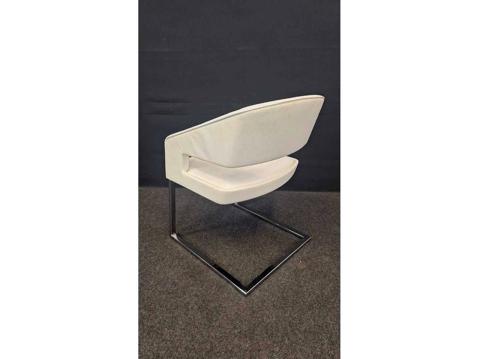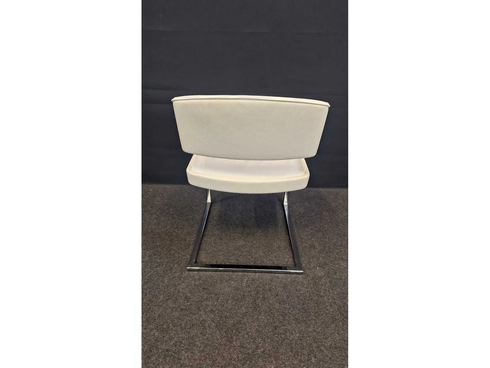Slede onderstel in metaal hoogglans verchroomd, bekleding in leder kleur Wit, gebruikssporen aanwezig leder te reinigen No Merk: NN Kleur: Wit Materiaal: Metaal, kunststof, leder Zithoogte: 43cm Hoogte: 80cm Breedte: 60cm Diepte: 60cm Gewicht: 80kg