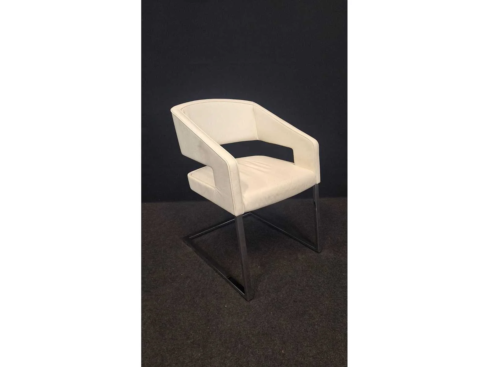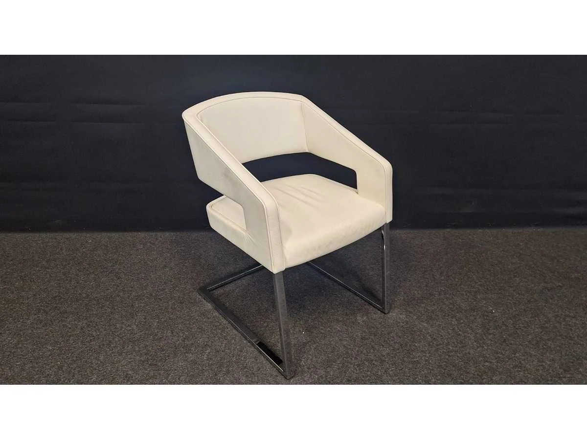 Slede onderstel in metaal hoogglans verchroomd, bekleding in leder kleur Wit, gebruikssporen aanwezig leder te reinigen No Merk: NN Kleur: Wit Materiaal: Metaal, kunststof, leder Zithoogte: 43cm Hoogte: 80cm Breedte: 60cm Diepte: 60cm Gewicht: 120kg