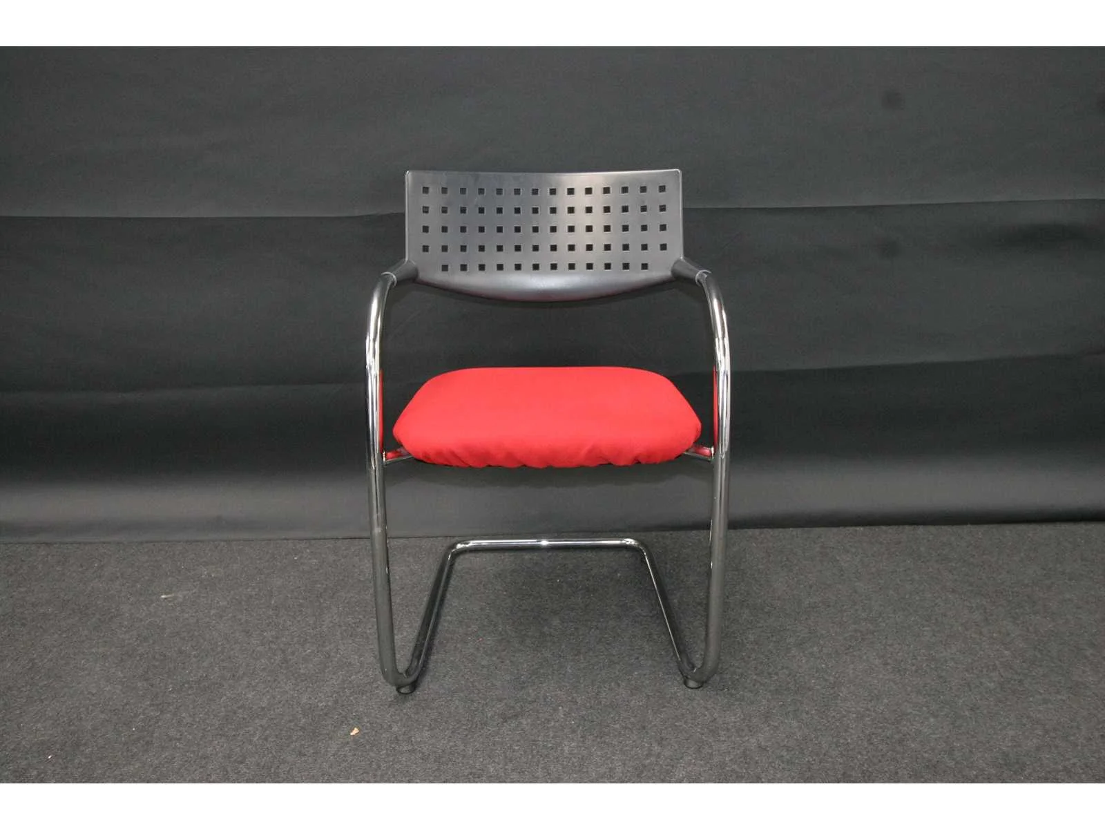 Hoogglans verchroomd metalen sledeframe, zitting bekleding in Rode vuur vertragende en slijtvaste stof, rugleuning in kunststof kleur Zwart, armsteunen afgewerkt met kunststof opleg, zeer representatieve en luxe bezoekersstoel, in zeer goede staat, bekleding chemisch gereinigd No Merk: Vitra Type: Visavis Kleur: Rood-Zwart-Chroom Gewicht: 40kg Breedte: 60cm Hoogte: 70cm Zithoogte: 43cm Diepte: 60cm Materiaal: Metaal, kunststof, chroom, stof