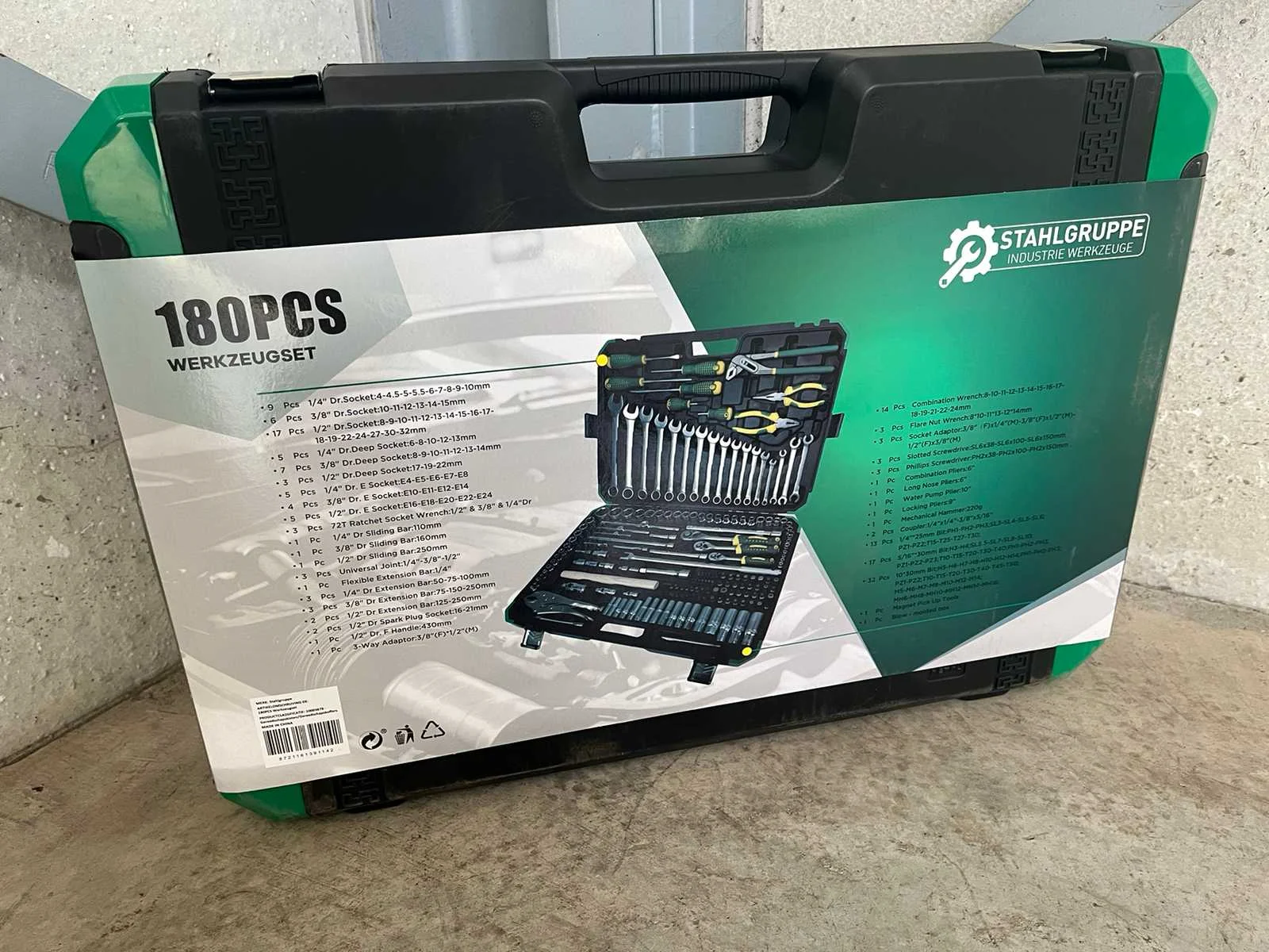 <ul> <li><strong>gereedschapsset:</strong> 180-delig</li> <li><strong>doppen:</strong> 1/4", 3/8", 1/2" (standaard, diep, E-profiel, bougie)</li> <li><strong>ratels:</strong> 1/4", 3/8", 1/2" met quick-release</li> <li><strong>ringsleutels:</strong> 8–22 mm</li> <li><strong>bits:</strong> Torx, PH, PZ, SL, Hex (kort & lang)</li> <li><strong>tangen:</strong> combinatietang, telefoontang, waterpomptang</li> <li><strong>toebehoren:</strong> verlengstukken, scharnieren, schroevendraaiers, hamer</li> <li><strong>koffer:</strong> slagvaste ABS opbergkoffer</li> <li><strong>staat:</strong> ongebruikt, in originele verpakking</li> </ul> Nee Merk: Stahlgruppe