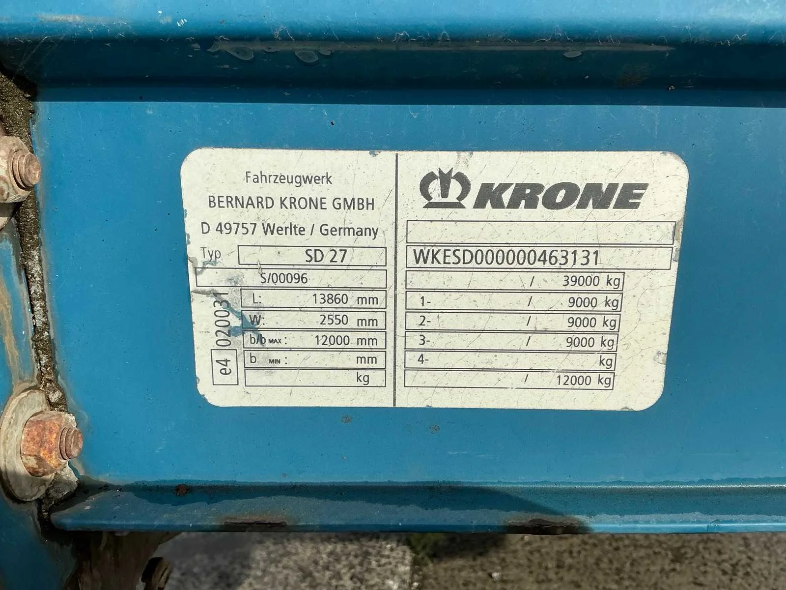<li> voorzien van Trommelremmen </ul> <li>Belgische inschrijvingsformulieren aanwezig</ul> <li>keuringsbewijs geldig tot: 19/02/2024</ul> <li>gebruikssporen</ul> Nee Merk: Krone Type: SD 27 Bouwjaar: 2010 Chassisnummer VIN: WKESD000000463131 Datum eerste toelating: 12/03/2010 Aantal assen: 3 Laadvermogen: 39000kg Eigen gewicht: 6620kg Totale afmeting L: 13860mm Totale afmeting Breedte: 2550mm Totale afmeting Hoogte: 2850mm