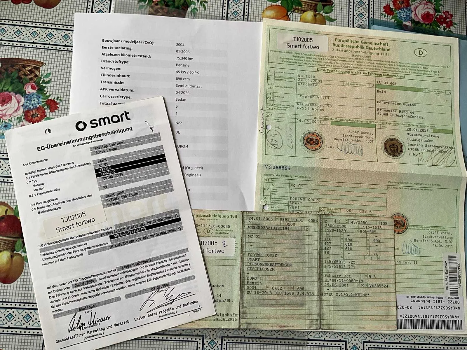 Boorddocumenten: gelijkvormigheidsattest, Duits inschrijvingsbewijs, invoerdocument douane Nee Merk: Smart Model: Fortwo Coupe Bouwjaar: 2004 Afgelezen kilometerstand: 75340km Cilinderinhoud: 698cc Vermogen (kW): 45kW Brandstof: benzine Chassisnummer: WME4503321J181194 Datum eerste toelating: 25/01/2005 Aantal zitplaatsen: 2 Kleur: Rood Transmissie: Semi-automaat Emissieklasse: Euro 4 Aantal deuren: 2 Aantal sleutels: 1 startinformatie : Start en rijdt