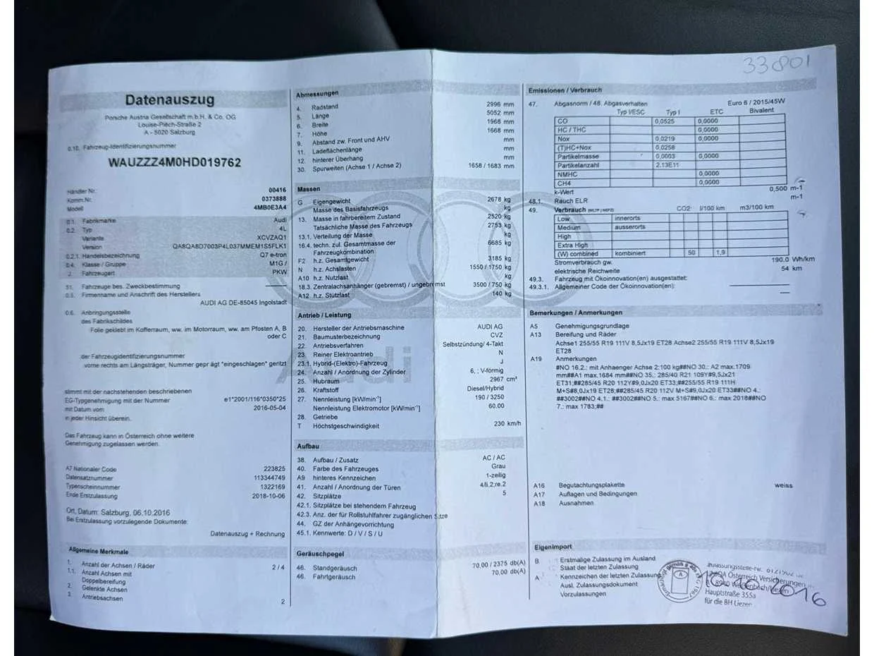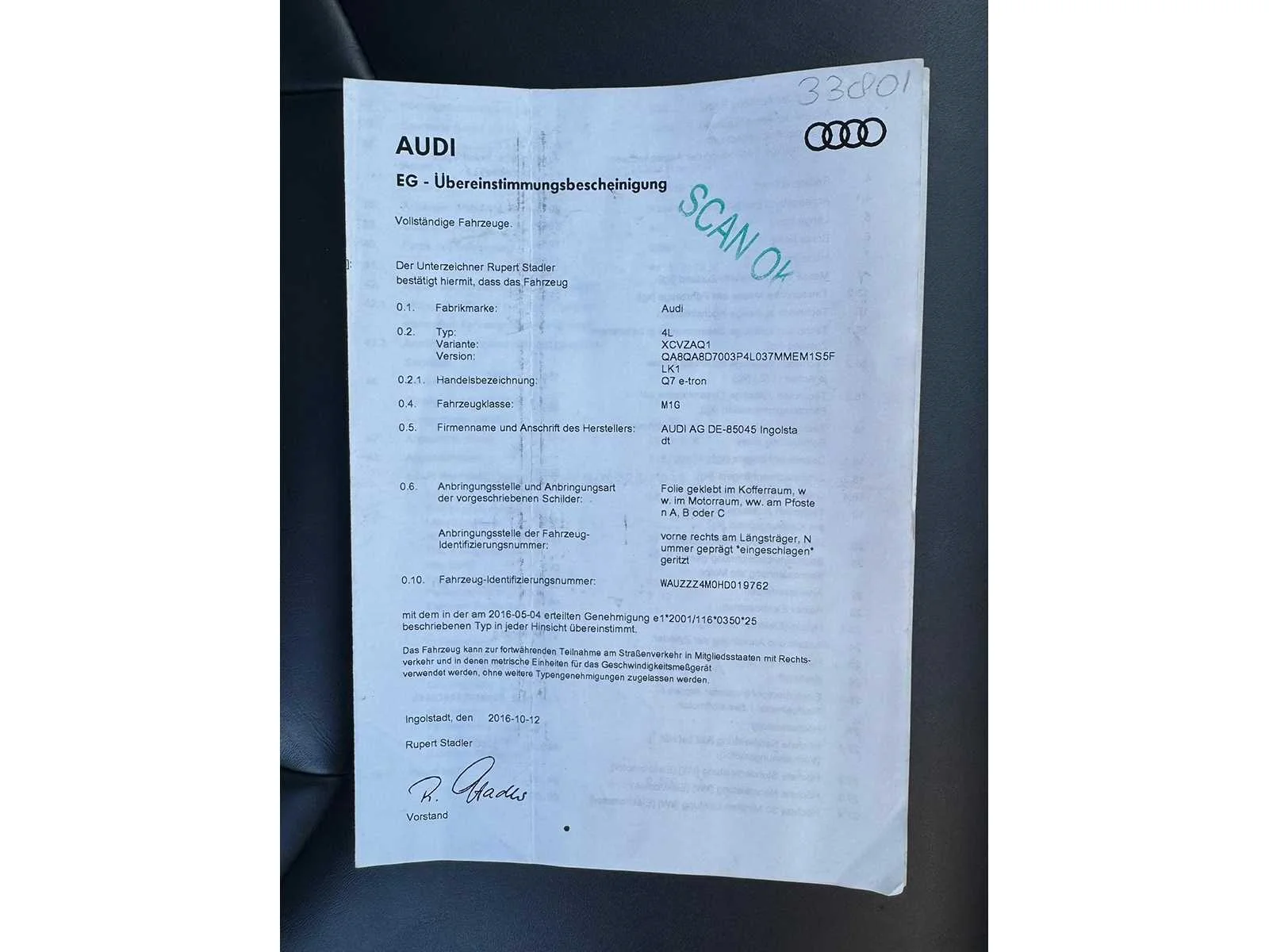 Nee Merk: Audi Model: Q7 S Line Type: E-Tron Bouwjaar: 2016 Afgelezen kilometerstand: 220000km Cilinderinhoud: 2967cc Vermogen (kW): 190kW Brandstof: Diesel/elektrsich Hybride Chassisnummer: WAUZZZ4MXHD19762 Aandrijving: AWD Aantal zitplaatsen: 5 Transmissie: Automaat Emissieklasse: Euro 6b Aantal deuren: 5 Nationaliteit documenten: België Gelijkvormigheidsattest aanwezig: true Start en rijdt: Ja Vavato voert geen technische keuring uit.: true Airconditioning: true Navigatie: true LED-koplampen: true Leder bekleed: true Vierwielaandrijving 4x4: true Inschrijvingsbewijs - deel 1 : Aanwezig Inschrijvingsbewijs - deel 2: Aanwezig