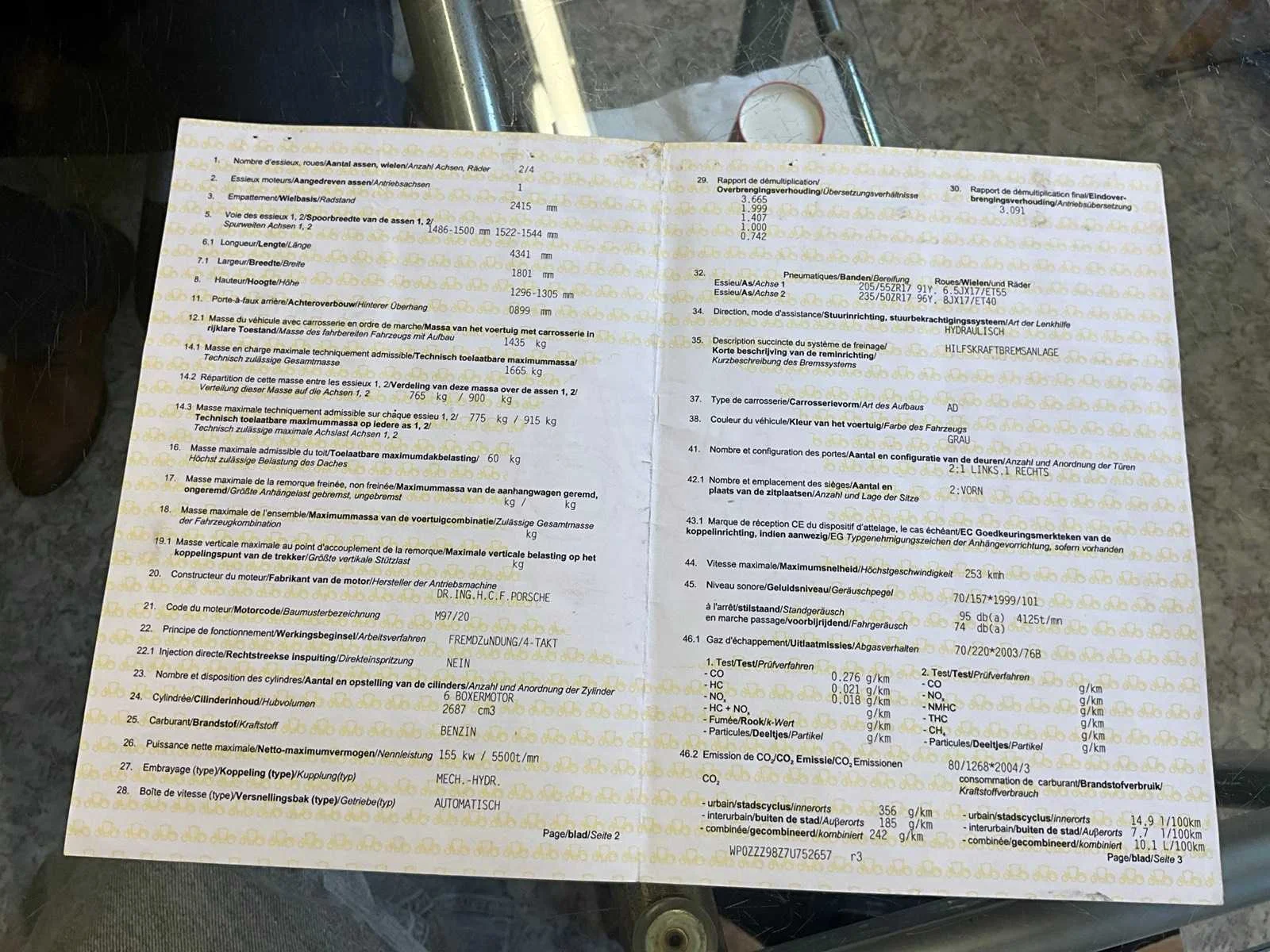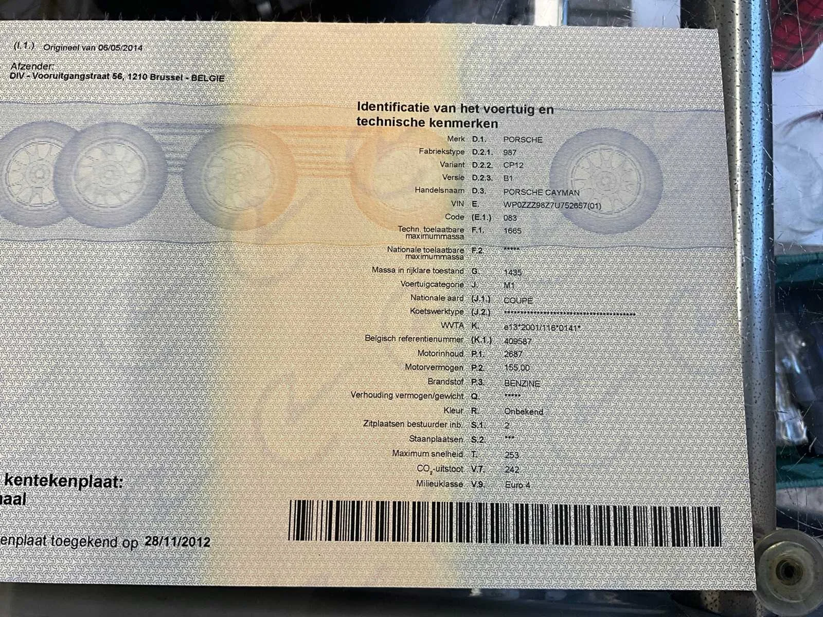 Heeft een automatische achterspoiler. Nee Merk: Porsche Model: Cayman Bouwjaar: 2007 Afgelezen kilometerstand: 127547km Cilinderinhoud: 2687cc Vermogen (kW): 155kW Brandstof: benzine Chassisnummer: WP0ZZZ98Z7U752657 Datum eerste toelating: 02/01/2007 Vermogen (pk): 211hp Aantal zitplaatsen: 2 Transmissie: Automaat Emissieklasse: Euro 4 Aantal deuren: 3 Nationaliteit documenten: Belgisch Start en rijdt: Ja startinformatie : Start & rijdt Vavato voert geen technische keuring uit.: true Airconditioning: true Leder bekleed: true Inschrijvingsbewijs - deel 1 : Aanwezig Inschrijvingsbewijs - deel 2: Aanwezig