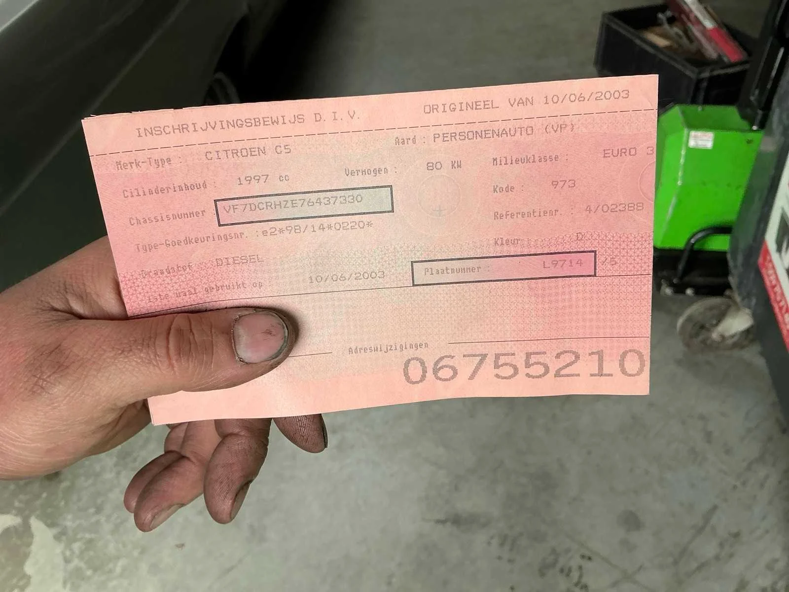 Nee Merk: Citroën Model: C5 Bouwjaar: 2003 Afgelezen kilometerstand: 163275km Cilinderinhoud: 1995cc Vermogen (kW): 80kW Brandstof: diesel Chassisnummer: VF7DCRHZE76437330 Datum eerste toelating: 10/06/2003 Aantal zitplaatsen: 5 Kleur: Grijs Transmissie: Automaat Emissieklasse: EURO 3 Aantal deuren: 4 Aantal sleutels: 2 Nationaliteit documenten: Belgisch Onderhoudshistorie: YES Gelijkvormigheidsattest aanwezig: true Start en rijdt: YES Keuringsrapport geldig tot: 10/04/2026 Inschrijvingsbewijs - deel 1 : Aanwezig Inschrijvingsbewijs - deel 2: Aanwezig