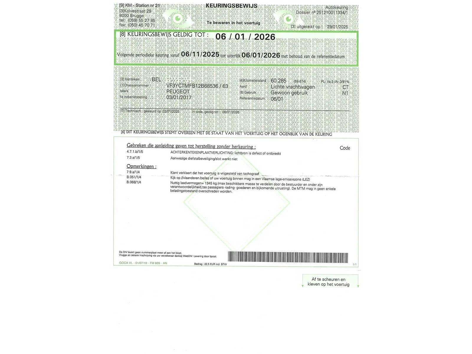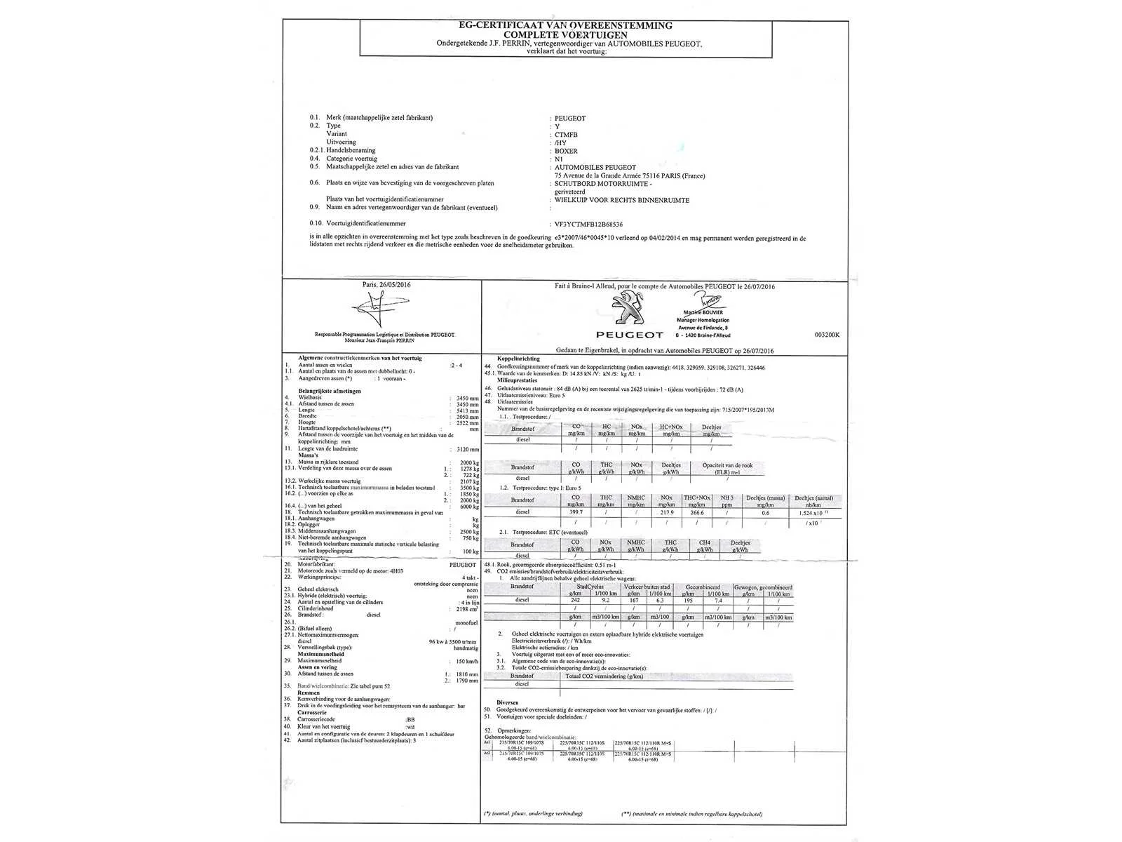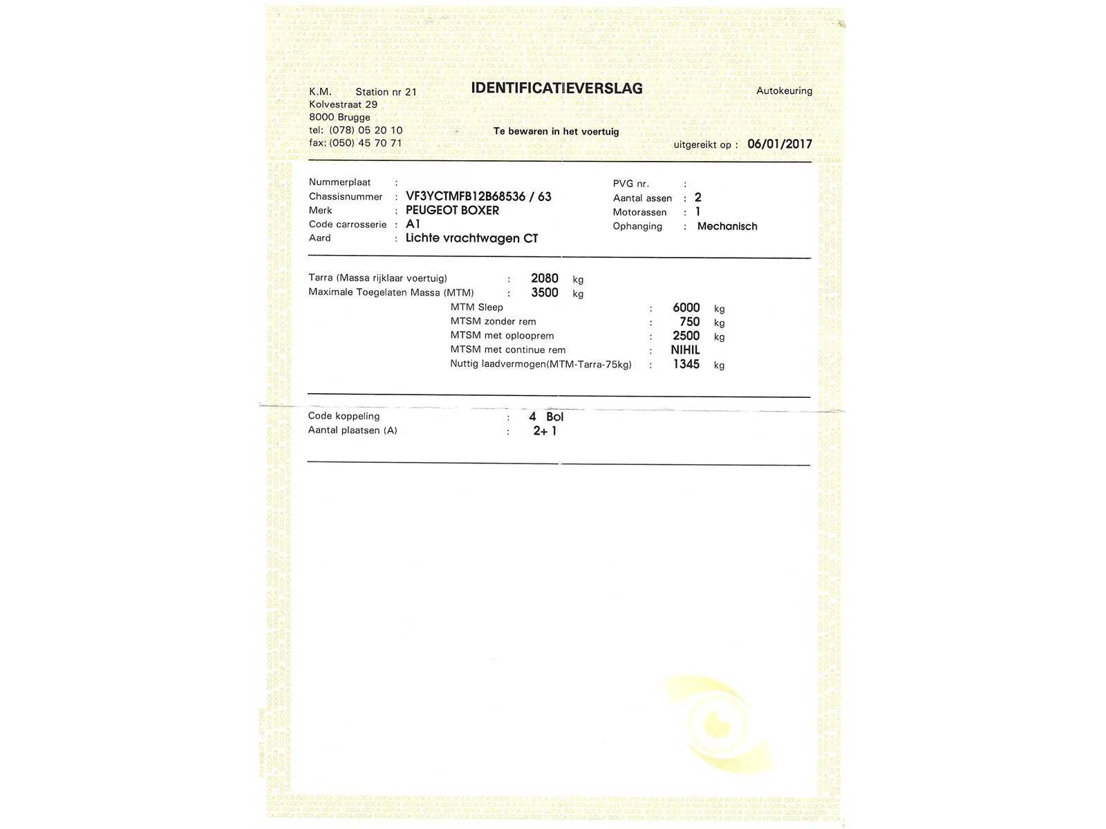 Nee Merk: Peugeot Model: Boxer Bouwjaar: 2017 Chassisnummer: VF3YCTMFB12B68536 Afgelezen kilometerstand: 65159km Cilinderinhoud: 2198cc Vermogen (kW): 96kW Brandstof: Diesel Datum eerste inschrijving: 03/01/2017 Aandrijving: Voorwiel Transmissie: Manueel Aantal zitplaatsen: 3 Kleur: Wit Nationaliteit documenten: BE Aantal deuren: 5 Aantal sleutels: 2 Laadvermogen: 1345kg Aantal cilinders: 4 Emissieklasse: 5B Kentekenpapieren compleet?: true Boorddocumenten aanwezig?: true Onderhoudshistorie: JA Startinformatie: Start en Rijdt Maximaal trekgewicht ongeremd: 750 Maximaal trekgewicht geremd: 2500 Self drive export possible : true