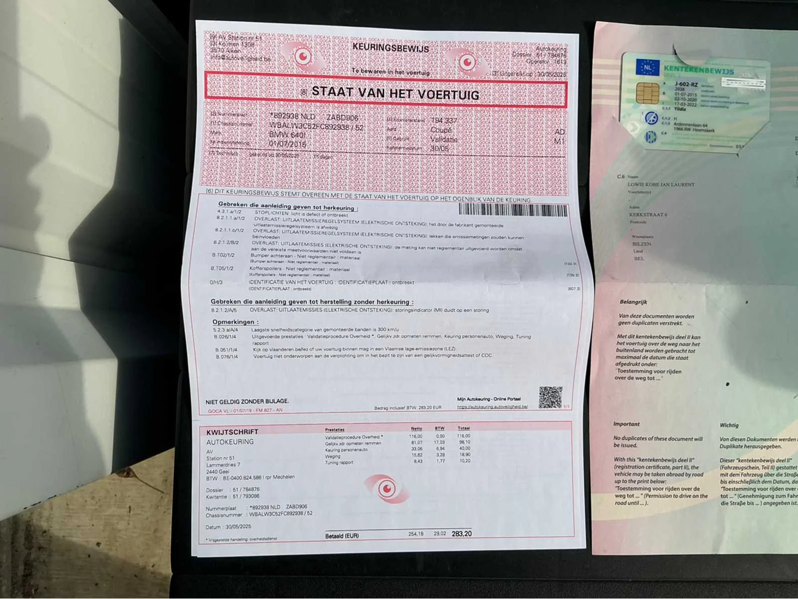 Zeer sportieve en luxueuze coupé in alpine witte kleur, met zwart M-interieur en vele opties. Uitgerust met krachtige 3.0 liter zes in lijn benzinemotor, TwinPower Turbo (235 kW / 320 pk bij 5800 R/min) gekoppeld aan een automatische (8-traps ZF) transmissie. Kilometerstand ±192.000 km. Nog extra voorzien van downpipe en Akrapovic uitlaatpunten. De wagen is voorzien van zwarte M-velgen,sportstoelen met memory, groot navigatiescherm, HUD Head Up Display, automatische airco, parkeersensoren en achteruitrijcamera. Zowel exterieur als interieur in nette staat, met gebruikssporen passend bij de leeftijd en kilometerstand. Gebreken die aanleiding geven tot herkeuring 1. 6.2.1.1.a/3 • Sproeiers, glas en elektrische ontsteking defect. • Opmerking: uitlaatemissies elektrische ontsteking → door defect kunnen emissiegrenzen overschreden worden. 2. 8.2.1.2/h/2 • Uitlaatemissies elektrische ontsteking – overschrijding emissiewaarden. 3. B. T05/1/2 • OBD (On-Board Diagnostics): MIL (storingslampje motor) duidt op een fout. 4. QH3 • Identificatie voertuig – identificatieplaat ontbreekt of is onleesbaar. Gebreken die aanleiding geven tot herstelling zonder herkeuring • 8.2.1.2/k/5 Uitlaatemissies elektrische ontsteking (MIL duidt op een storing). Opmerkingen • 5.2.3.1/a/4: Linkse achterste en voorste banden 30% verschil in omtrek. • 8.5.1/h/4: OBD – foutcodes opgeslagen (emissie gerelateerd). • B. O6/1/4: OBD – foutcodes in verband met ontstekings-/verbrandingssystemen en EDC. • B. O6/1/14: OBD – foutcodes in verband met adaptieve systemen. Nee Merk: BMW Model: 640i M pakket Bouwjaar: 2015 Afgelezen kilometerstand: 197060km Cilinderinhoud: 2979cc Vermogen (kW): 235kW Brandstof: benzine Chassisnummer: WBALW3C52FC892938 Laadvermogen: 450kg Vermogen (pk): 320hp Aandrijving: RWD Aantal zitplaatsen: 4 Kleur: Wit Transmissie: Automaat USA titel: Ja Stuurwiel: Multifunctioneel Aantal deuren: 3 Ledig gewicht: 1745kg Aantal cilinders: 6 Carrosserie: Coupé Nationaliteit documenten: Amerika- Nederland Start en rijdt: Ja Keuringsrapport geldig tot: 30/05/2025 Self drive export possible : true Vavato voert geen technische keuring uit.: true Airconditioning: true Navigatie: true Xenon verlichting: true LED-koplampen: true Leder bekleed: true