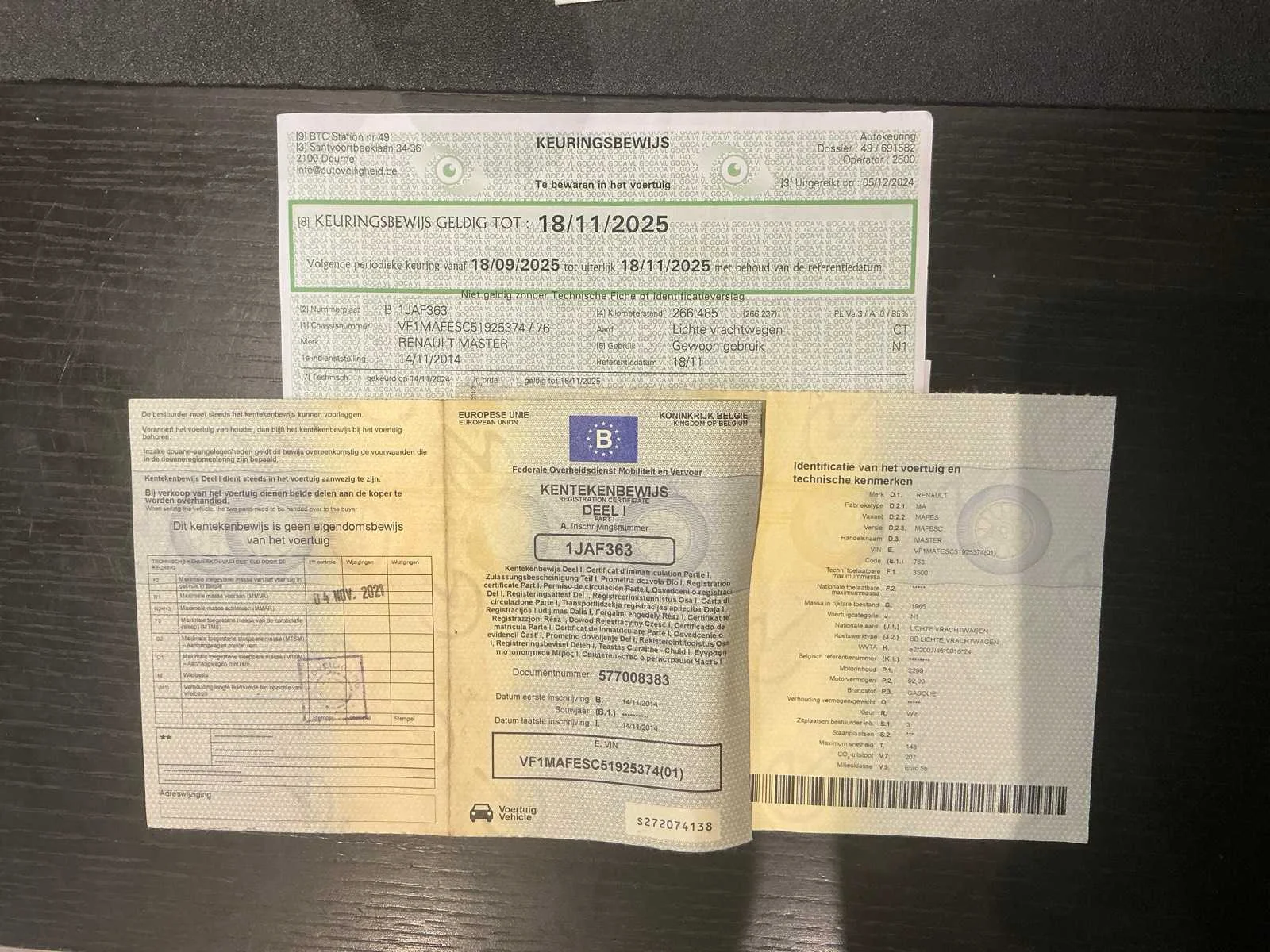 Achter deur moeilijk open te krijgen Nee Merk: Renault Model: Master Bouwjaar: 2014 Afgelezen kilometerstand: 267105km Cilinderinhoud: 2299cc Vermogen (kW): 92kW Brandstof: diesel Chassisnummer: VF1MAFESC51925374 Datum eerste toelating: 14/11/2014 Vermogen (pk): 125hp Aantal zitplaatsen: 3 Kleur: Wit Transmissie: Handgeschakeld Emissieklasse: Euro 5b Aantal deuren: 5 Aantal sleutels: 1 Ledig gewicht: 1965kg Aantal cilinders: 4 Carrosserie: MPV Nationaliteit documenten: Belgische Gelijkvormigheidsattest aanwezig: true Start en rijdt: Ja Keuringsrapport geldig tot: 18/11/2025 Technische fiche: true startinformatie : Rijdt en start Zichtbare schade: JA zie foto’s Self drive export possible : true Inschrijvingsbewijs - deel 1 : Aanwezig Inschrijvingsbewijs - deel 2: Aanwezig