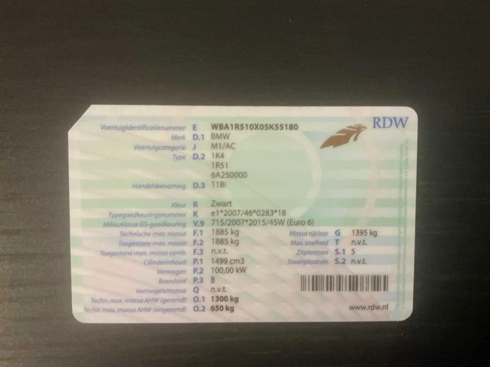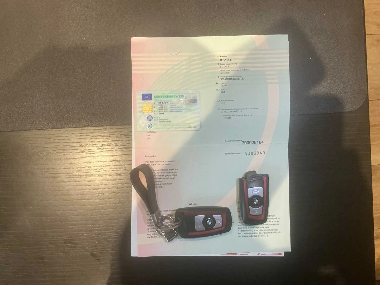 Gekeurd voor verkoop Nee Kenteken: RT-536-N Merk: BMW Model: 118i Bouwjaar: 2018 Afgelezen kilometerstand: 49500km Cilinderinhoud: 1499cc Vermogen (kW): 100kW Brandstof: benzine Chassisnummer: WBA1R510X05K55180 Laadvermogen: 500kg Datum eerste toelating: 06/02/2018 Vermogen (pk): 136hp Aandrijving: Voorwiel Aantal zitplaatsen: 5 Maximaal trekgewicht ongeremd: 650kg Maximaal trekgewicht geremd: 1300kg Kleur: Zwart Transmissie: Automaat Emissieklasse: Euro 6 Aantal deuren: 5 Aantal sleutels: 2 Ledig gewicht: 1395kg Aantal cilinders: 3 Carrosserie: Hatchback Nationaliteit documenten: Nederland Onderhoudshistorie: Aanwezig Carpass: true Start en rijdt: Ja Zichtbare schade: Neen Self drive export possible : true Vavato voert geen technische keuring uit.: true Airconditioning: true Navigatie: true Xenon verlichting: true LED-koplampen: true Leder bekleed: true Inschrijvingsbewijs - deel 1 : Aanwezig Inschrijvingsbewijs - deel 2: Aanwezig
