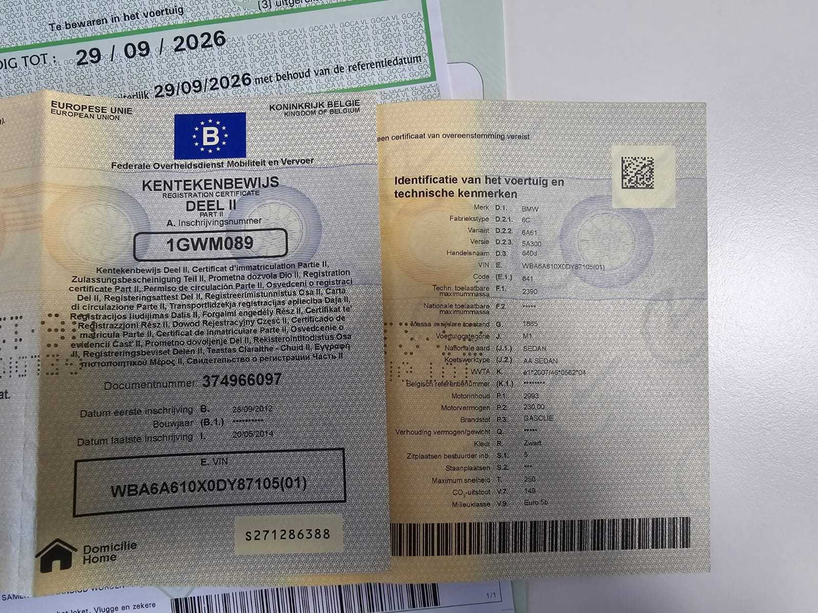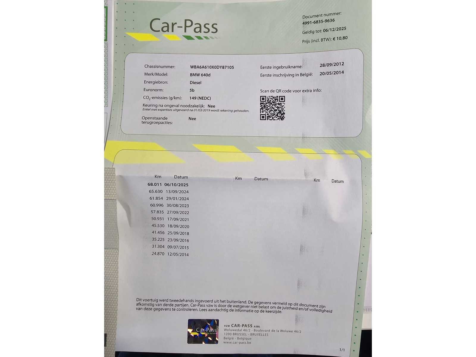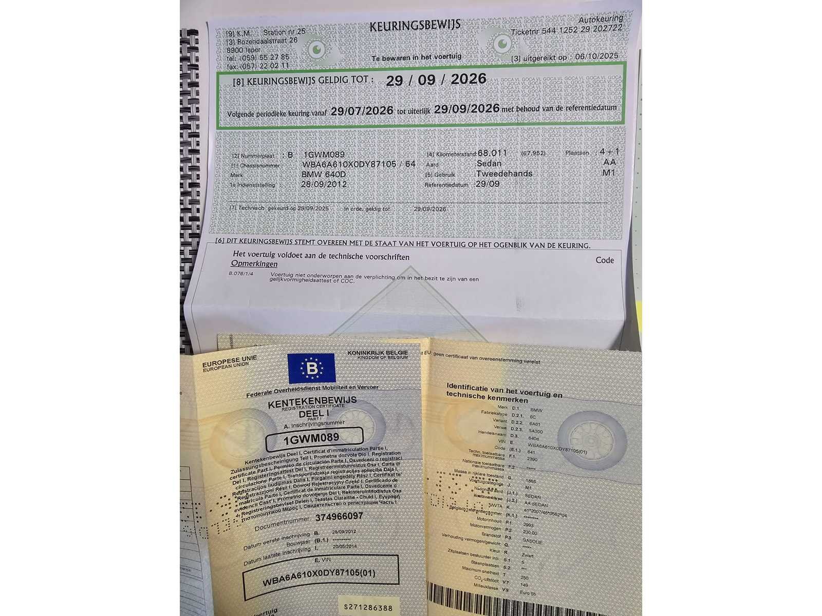 Volledige onderhoudshistorie bij bmw aanwezig. Nee Merk: BMW Model: 640d Bouwjaar: 2012 Afgelezen kilometerstand: 68044km Brandstof: diesel Datum eerste toelating: 28/09/2012 Transmissie: Automaat Nationaliteit documenten: Belgisch Start en rijdt: Ja startinformatie : Start en rijdt Inschrijvingsbewijs - deel 1 : Aanwezig Inschrijvingsbewijs - deel 2: Aanwezig