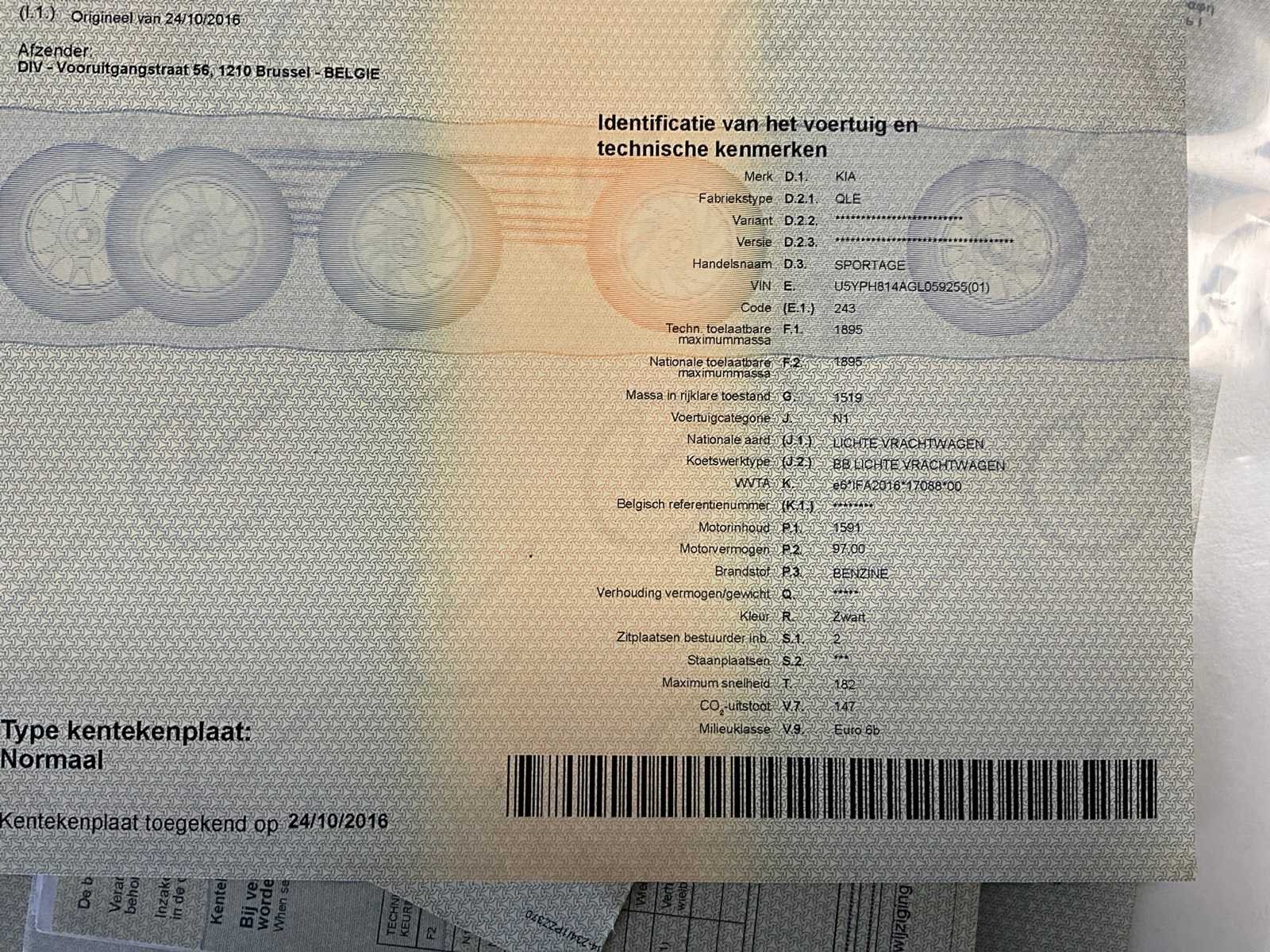 Nee Merk: Kia Model: Sportage Bouwjaar: 2016 Afgelezen kilometerstand: 83952km Cilinderinhoud: 1591cc Vermogen (kW): 97kW Chassisnummer: U5YPH814AGL059255 Datum eerste toelating: 24/10/2016 Transmissie: Handgeschakeld Aantal sleutels: 2 Nationaliteit documenten: Belgisch Start en rijdt: Ja startinformatie : Start en rijdt Inschrijvingsbewijs - deel 1 : Aanwezig Inschrijvingsbewijs - deel 2: Aanwezig