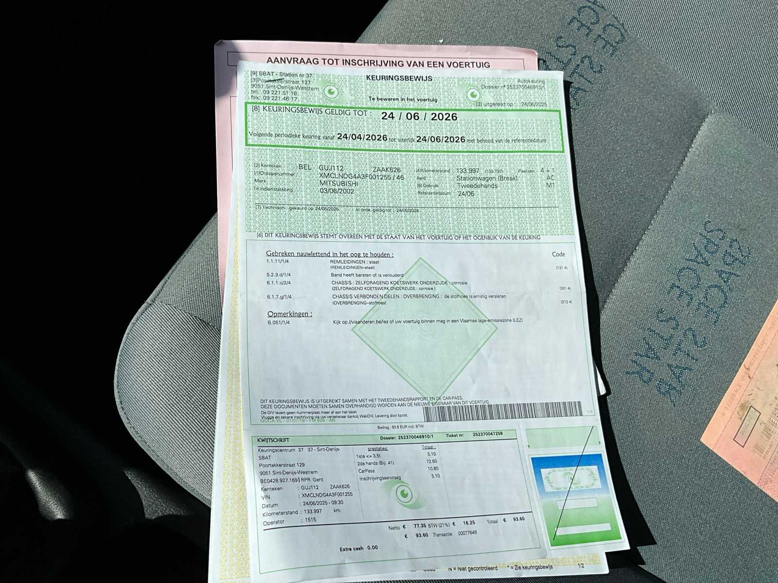 Werkende airco. Carrosserie proper. Alles in goed werkende staat - klaar om in te schrijven. Nee Merk: Mitsubishi Model: Space star Bouwjaar: 2002 Afgelezen kilometerstand: 134044km Cilinderinhoud: 1870cc Vermogen (kW): 75kW Brandstof: diesel Chassisnummer: XMCLNDG4A3F001255 Datum eerste toelating: 16/09/2003 Transmissie: Handgeschakeld Nationaliteit documenten: Belgisch Start en rijdt: Ja startinformatie : Start en rijdt Inschrijvingsbewijs - deel 1 : Aanwezig Inschrijvingsbewijs - deel 2: Aanwezig