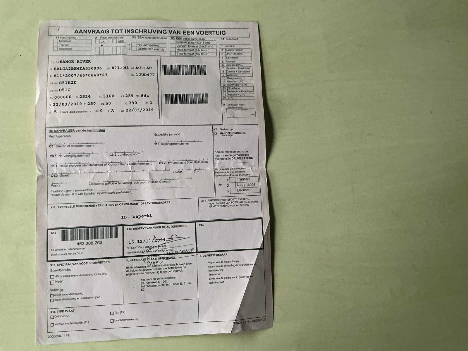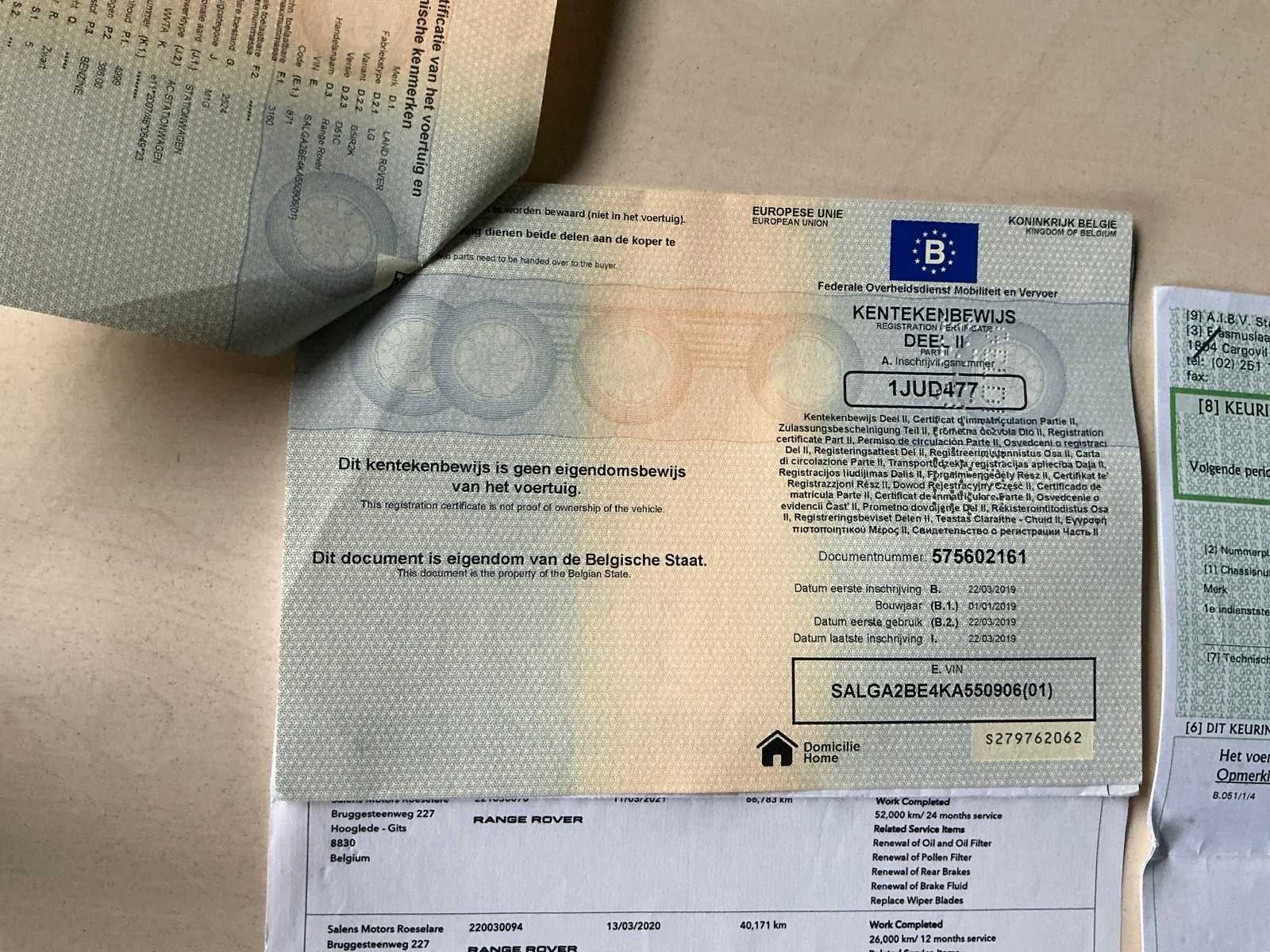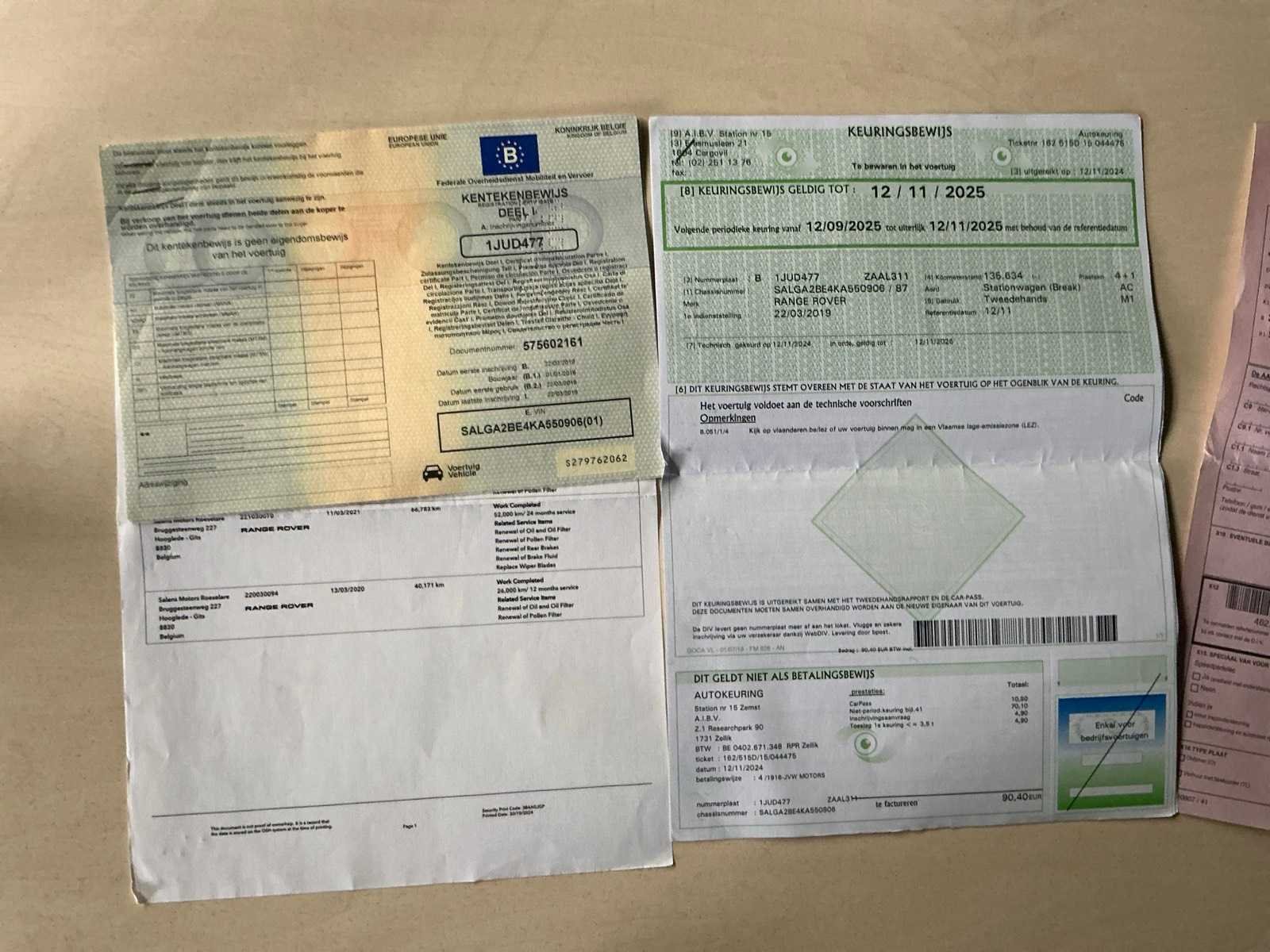 Range Rover Vogue, btw wagen, full option Nee Merk: Range Rover Model: Vogue Type: SUV Bouwjaar: 2019 Afgelezen kilometerstand: 147719km Vermogen (kW): 386kW Brandstof: benzine Chassisnummer: SALGA2BE4KAA550906(01) Datum eerste toelating: 22/03/2019 Aandrijving: 4x4 Aantal zitplaatsen: 5 Kleur: Zwart Transmissie: Automaat Aantal deuren: 5 Aantal sleutels: 2 Nationaliteit documenten: België Start en rijdt: Ja Keuringsrapport geldig tot: 12/11/2025 Inschrijvingsbewijs - deel 1 : Aanwezig Inschrijvingsbewijs - deel 2: Aanwezig