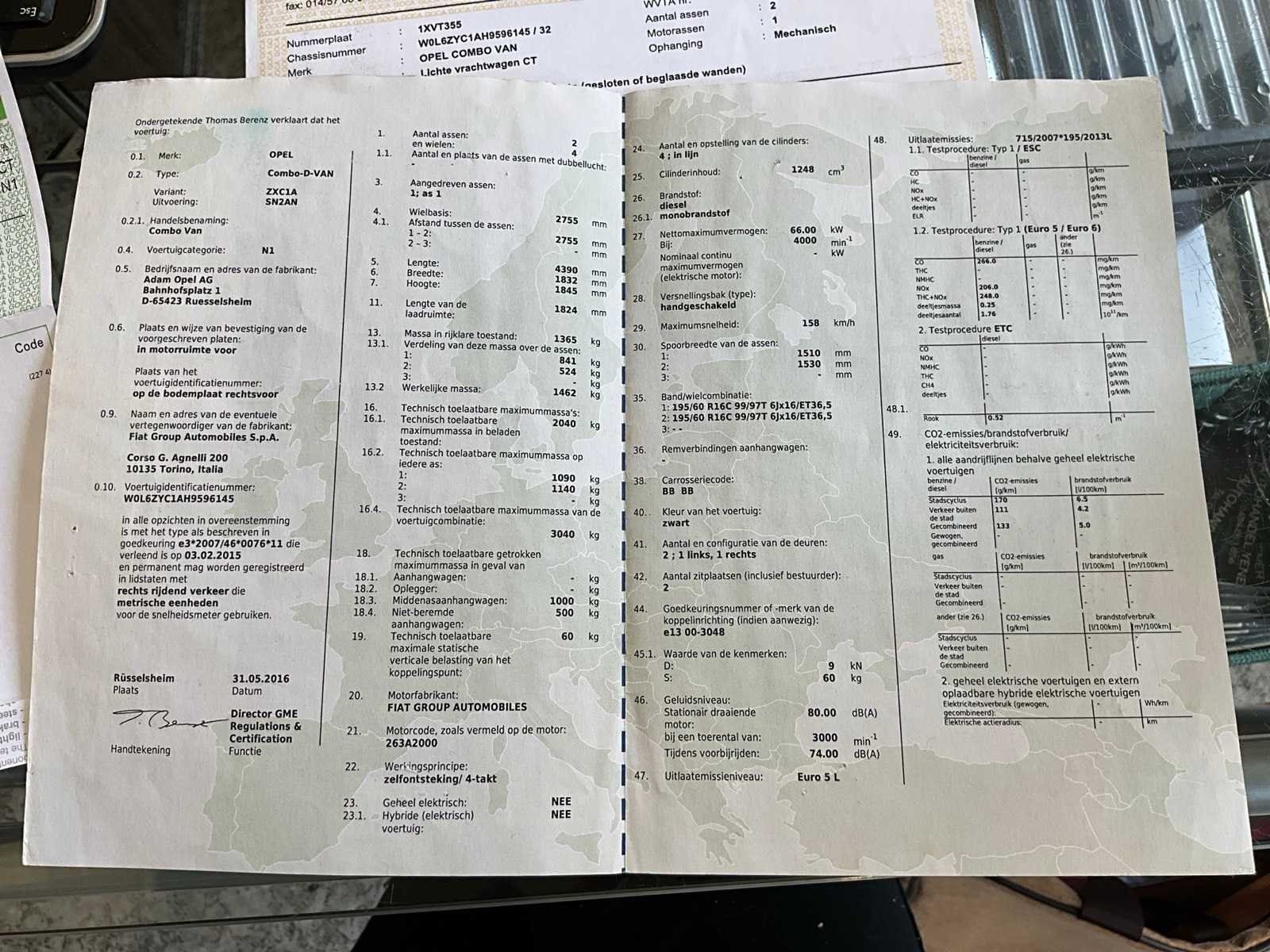 Nieuwe turbo en 4 nieuwe banden. Nee Merk: Opel Model: Combo-D-Van Bouwjaar: 2016 Afgelezen kilometerstand: 114155km Cilinderinhoud: 1248cc Vermogen (kW): 66kW Brandstof: diesel Chassisnummer: W0L6ZYC1AH9596145 Datum eerste toelating: 23/06/2016 Aantal zitplaatsen: 2 Transmissie: Handgeschakeld Emissieklasse: Euro 5b Aantal deuren: 3 Aantal sleutels: 2 Nationaliteit documenten: Belgisch Start en rijdt: Ja startinformatie : Start & rijdt Vavato voert geen technische keuring uit.: true Airconditioning: true Inschrijvingsbewijs - deel 1 : Aanwezig Inschrijvingsbewijs - deel 2: Aanwezig