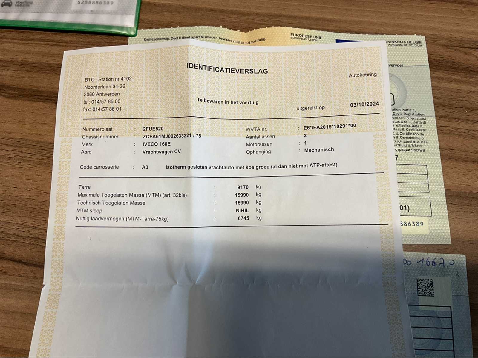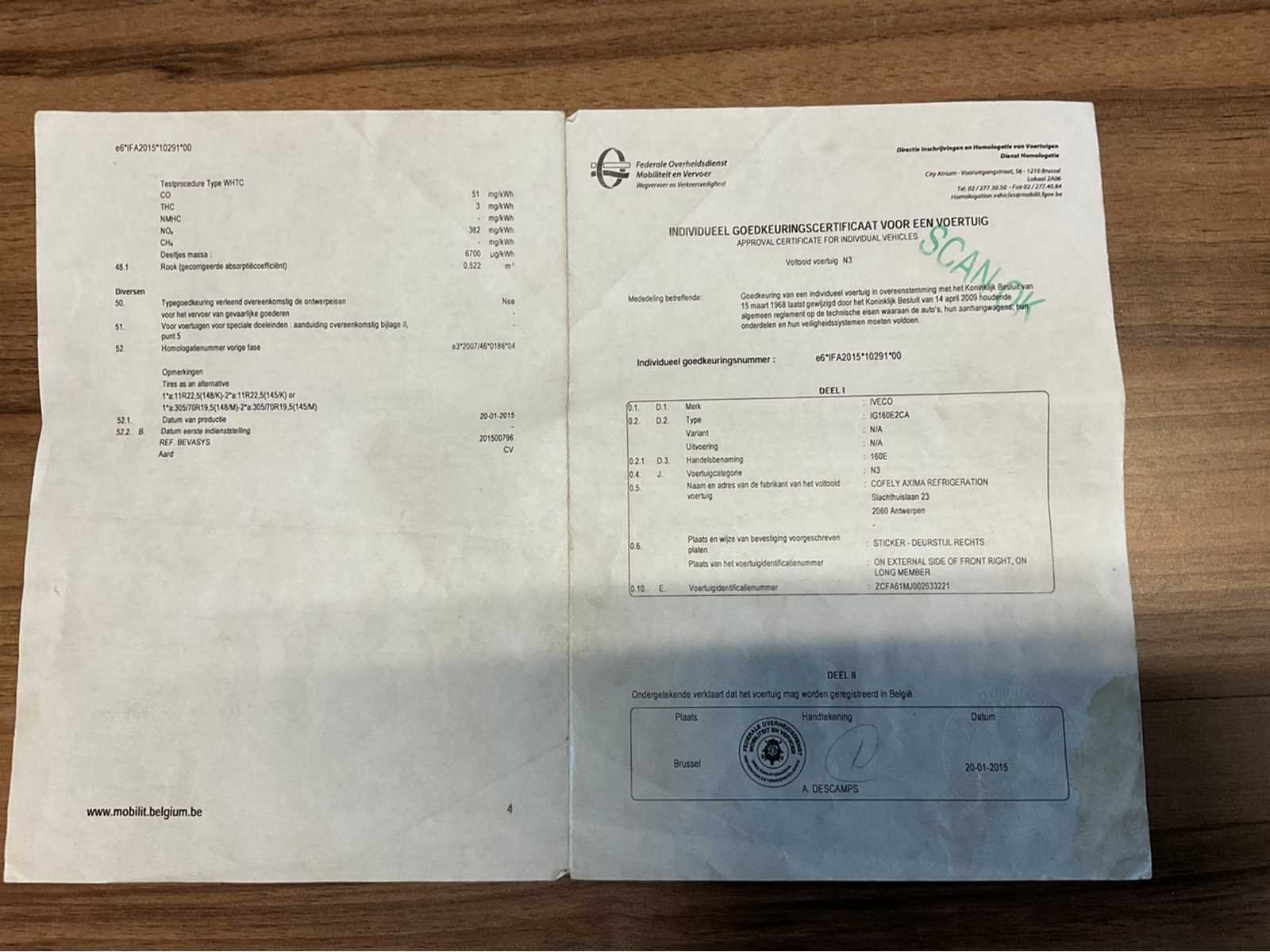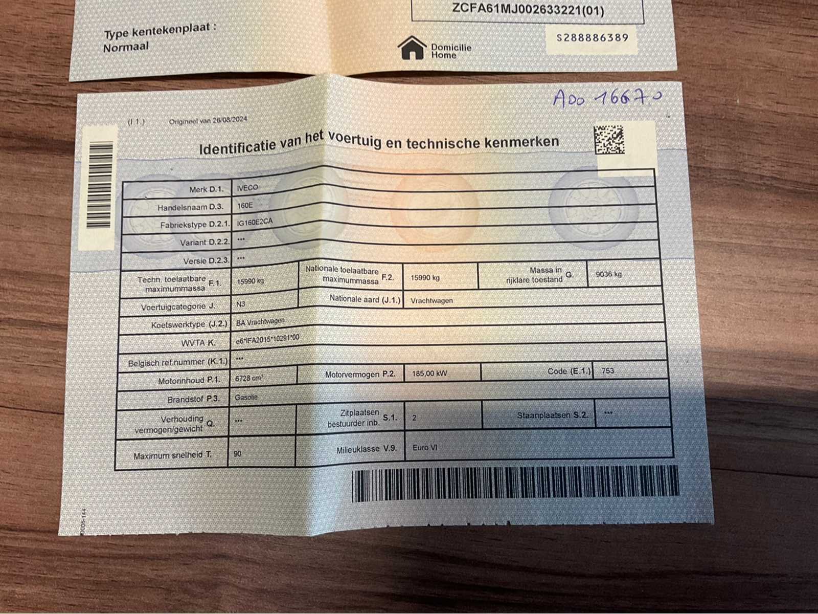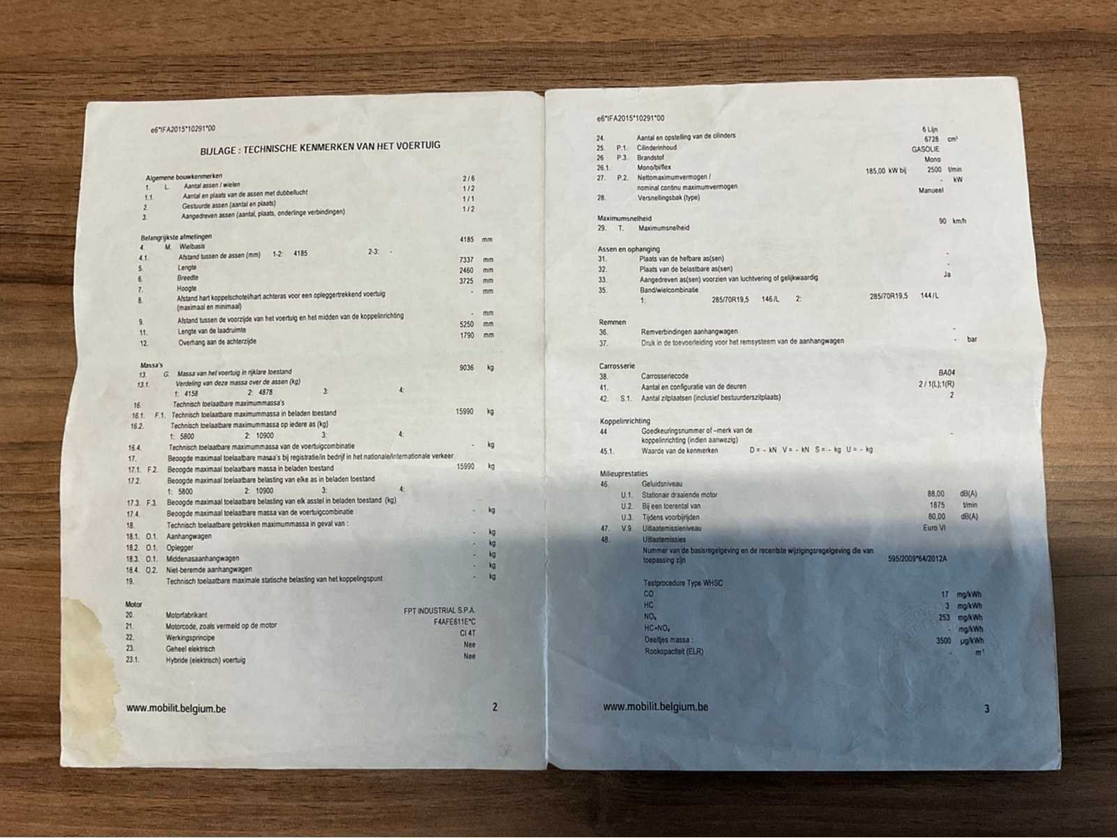 Vrachtwagen start en rijdt . Alle Documenten aanwezig Nee Merk: IVECO Type: IG160E2CA Bouwjaar: 2015 Chassisnummer VIN: ZCFA61MJ002633221 Cilinderinhoud: 6728cc Datum eerste toelating: 30/01/2015 Type transmissie: Automaat Aantal assen: 2 Fuel Type: Diesel Aantal sleutels: 2 Emissieklasse: EURO VI Hydraulische laadklep: true Gesloten opbouw: true Eigen gewicht: 9036kg Totale afmeting L: 7337mm Totale afmeting Breedte: 2460mm Totale afmeting Hoogte: 3725mm Startinformatie: Start en rijdt Afgelezen kilometerstand: 338019km Nationaliteit documenten: België Kentekenpapieren compleet?: true Aantal zitplaatsen: 2 Automaat: true Diesel: true