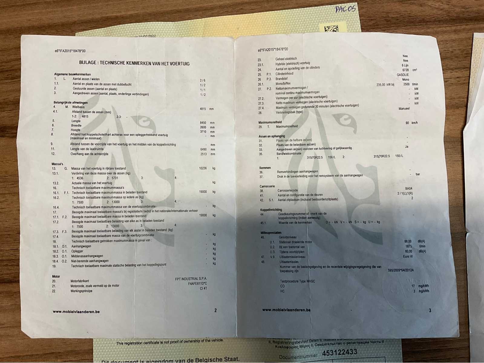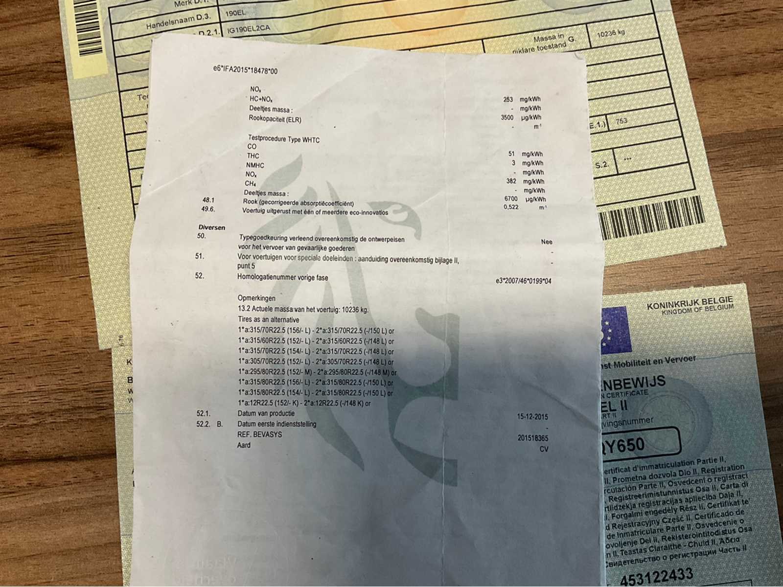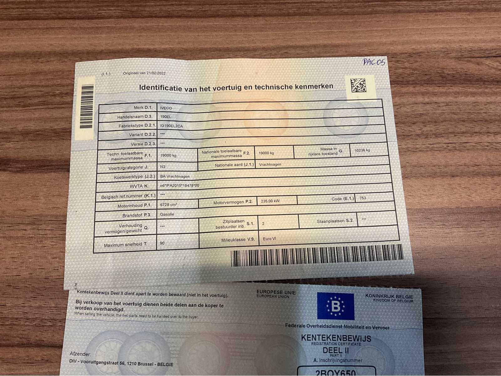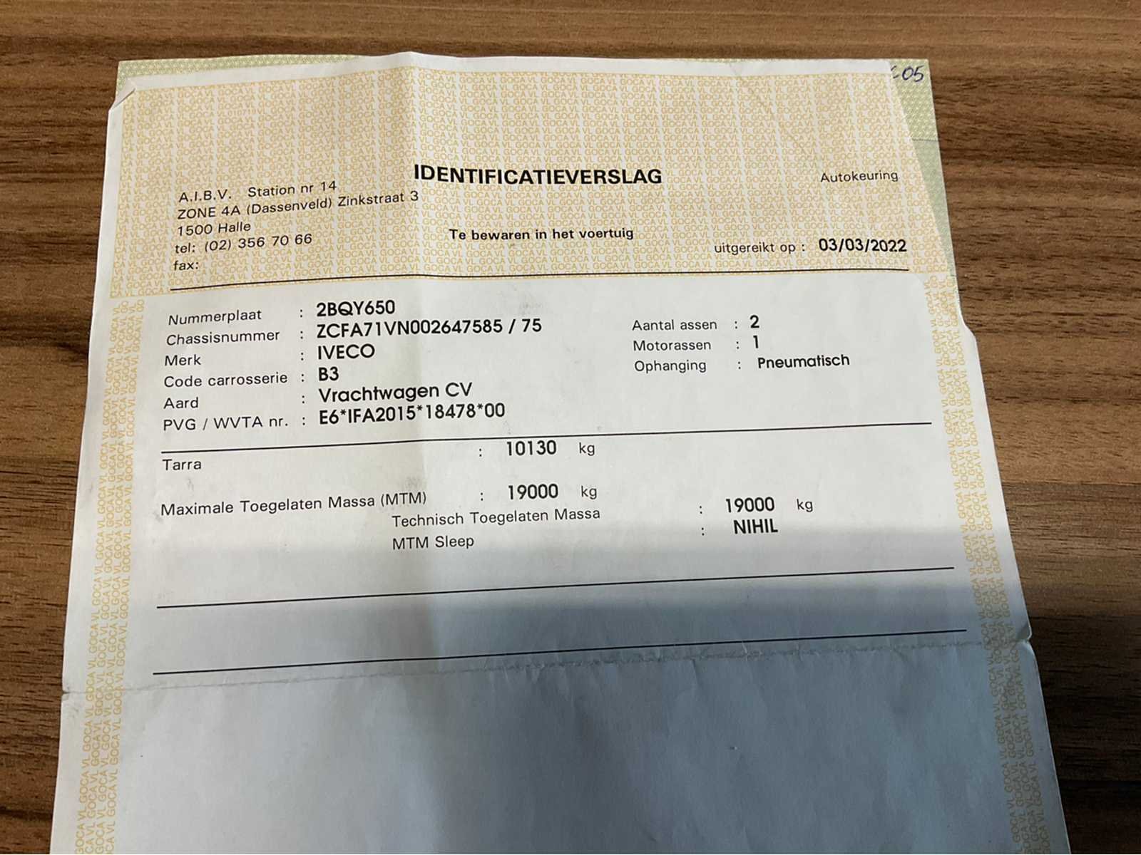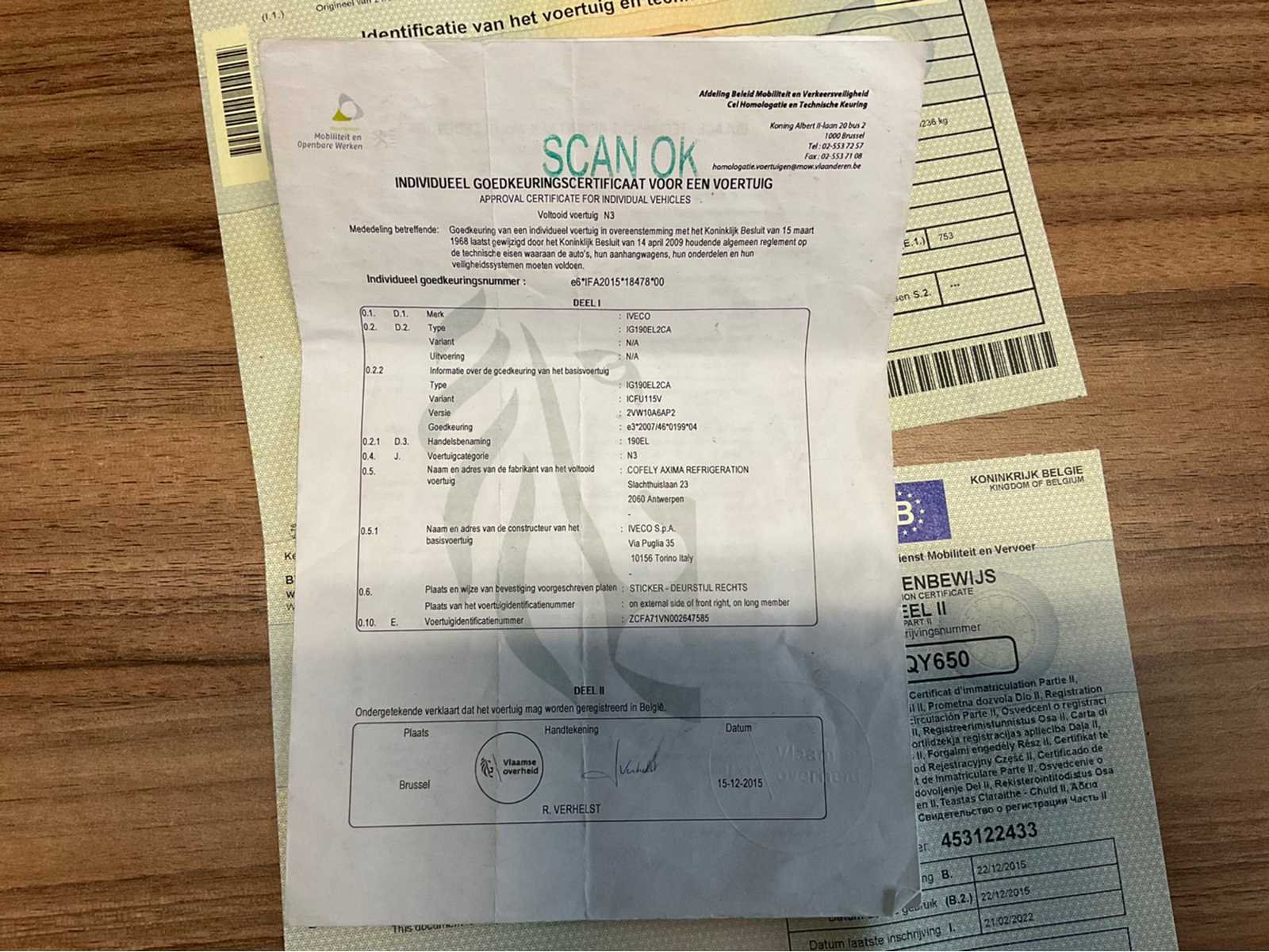 Vrachtwagen start en rijdt . Alle Documenten aanwezig Nee Merk: IVECO Type: IG190EL2CA Bouwjaar: 2015 Chassisnummer VIN: ZCFA71VN002647585 Cilinderinhoud: 6728cc Datum eerste toelating: 22/12/2015 Type transmissie: Automaat Aantal assen: 2 Fuel Type: Diesel Aantal sleutels: 2 Emissieklasse: EURO VI Hydraulische laadklep: true Gesloten opbouw: true Eigen gewicht: 10236kg Totale afmeting L: 8450mm Totale afmeting Breedte: 2600mm Totale afmeting Hoogte: 3710mm Startinformatie: Start en rijdt Afgelezen kilometerstand: 383142km Nationaliteit documenten: België Kentekenpapieren compleet?: true Aantal zitplaatsen: 2 Automaat: true Diesel: true