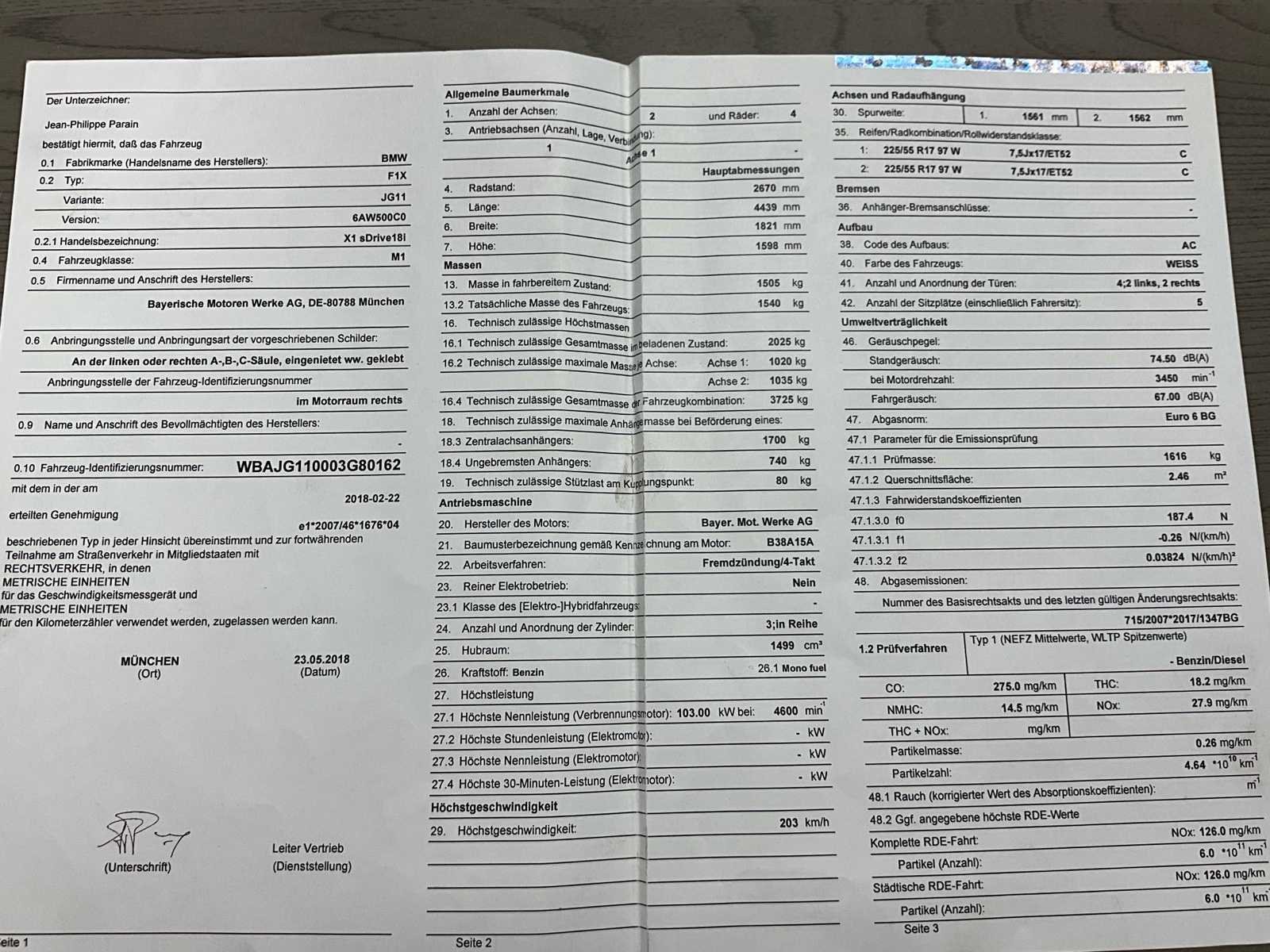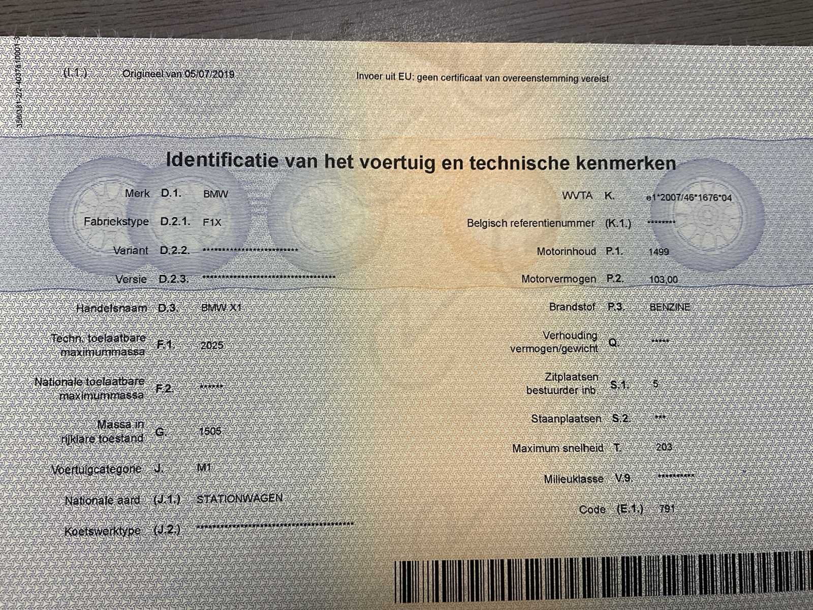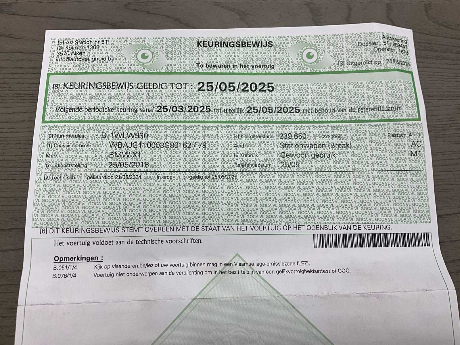 Algemeen zeer mooie staat: paar kleine puntjes van de lak op motorkap en zeer lichte gebruikssporen aan koffer (zie foto’s); amper krasjes aan de deurklinken (zie foto’s); airco; parkeersensoren; zetelverwarming - mistlicht rechts voor is defect. Nee Merk: BMW Model: X1 Type: stationwagen Bouwjaar: 2018 Afgelezen kilometerstand: 259120km Cilinderinhoud: 1499cc Vermogen (kW): 103kW Brandstof: benzine Chassisnummer: WBAJG110003G80162 Datum eerste toelating: 25/5/2018 Aantal zitplaatsen: 5 Kleur: wit Transmissie: automaat Aantal deuren: 5 Aantal sleutels: 2 Gelijkvormigheidsattest aanwezig: true Start en rijdt: ja Keuringsrapport geldig tot: 25/5/2025 Zichtbare schade: ja Vavato voert geen technische keuring uit.: true Airconditioning: true Navigatie: true Xenon verlichting: true LED-koplampen: true Inschrijvingsbewijs - deel 1 : aanwezig Inschrijvingsbewijs - deel 2: aanwezig